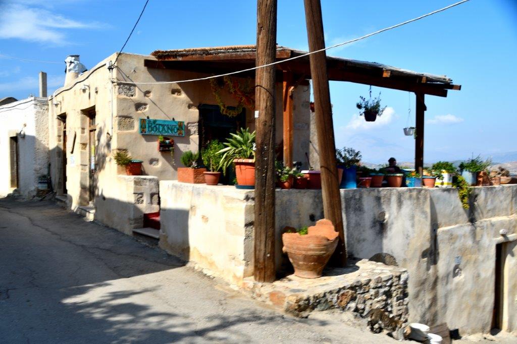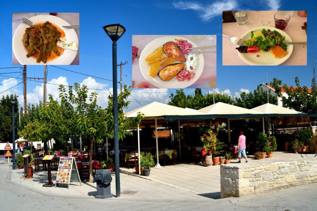 500 Menschen leben rund um den Mittelpunkt des Dorfes, den Dorfplatz mit Kirche, Kafenion und die Taverna Sactouris. An ihr konnten und wollten wir nicht vorbei fahren. Und schon saßen wir im Außenbereich des Restaurants. Kerstin empfahl es, weil es nicht die auf Touristengeschmack abgestellten Gerichte sondern traditionelle Küche mit einheimischen Produkten bot. Wir genossen sie: griechischer Salat, gebratener Käse, Pommes auf kretische Art, grüne Bohnen in Tomatensauce, in der Art von Moussaka zubereitete Auberginenhälften.