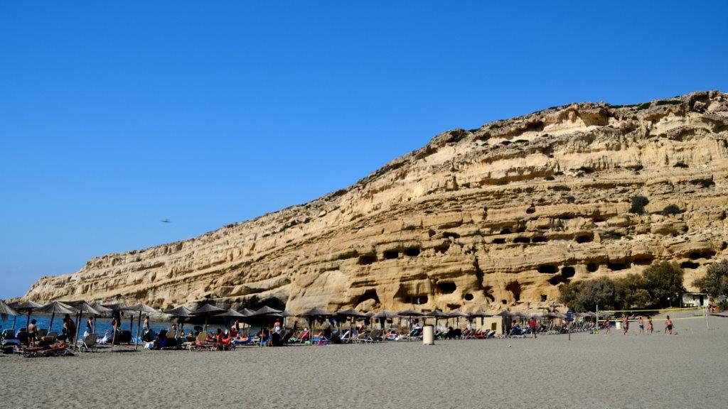 Wer in dieser Gegend den Süden der Insel aufsucht, darf nicht an Mátala vorbeifahren. Allein aus mythischen Gründen nicht. Vor unzähligen Götterjahren brachte der als Stier verkleidete Zeus die von ihm geraubte phönizische Prinzessin Europa an Land. In der Bucht von Mátala. Okeh, davon hatten wir schon gehört. Aber im heutigen Mátala war vom Anlanden der beiden nichts zu sehen. Seitdem vegetierte der Flecken vor sich hin. Bis Anfang der 1960er Jahre war der Ort eher ein Fischerstandort, wobei die Mehrzahl der Fischer im Hinterland wohnten. Also tote Hose. Bis die Hippie-Welle nach Europa (nicht zur Europa!) überschwappte. Die Blumenkinder wohnten in den Höhlen oberhalb der Bucht; man gründete eine Kommune; man lebte mehr oder weniger gut. Bis die Welle ausschwappte und die Normalität einkehrte. Aus dem Hippie- wurde ein ganz normaler Urlaubsort mit ausgezeichnetem Strandleben,
