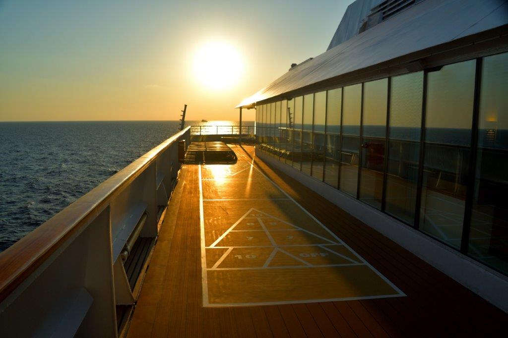 Anschließend schlichen wir über den Außenbereich von Deck 6. Auf der Suche nach freien Stühlen. Ohne Erfolg. Einige belegt mit Handtüchern, andere mit Hinterteilen bzw. Zweitstühle mit Füßen mit oder ohne Schuhe. Auch das Pooldeck war voll belegt. Also wichen wir weiter aus: Am Heck auf Deck 7 war Platz satt. Und Sonne. Und nahezu Windstille. Wir blieben dort fast den gesamten Nachmittag, lediglich unterbrochen vom Kaffeeschlürfen im Außenbereich des Calypso. Herrlich – das, was wir hinter uns ließen. Ein uns passendes Panorama. Blauer Himmel, vereinzelt Wolken. Blaues Meer, das von der Heckspur geteilt wurde. Vereinzelt Schiffe. Dösen, lesen, Sudokos lösen – bis zum Abendessen.