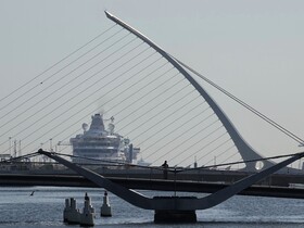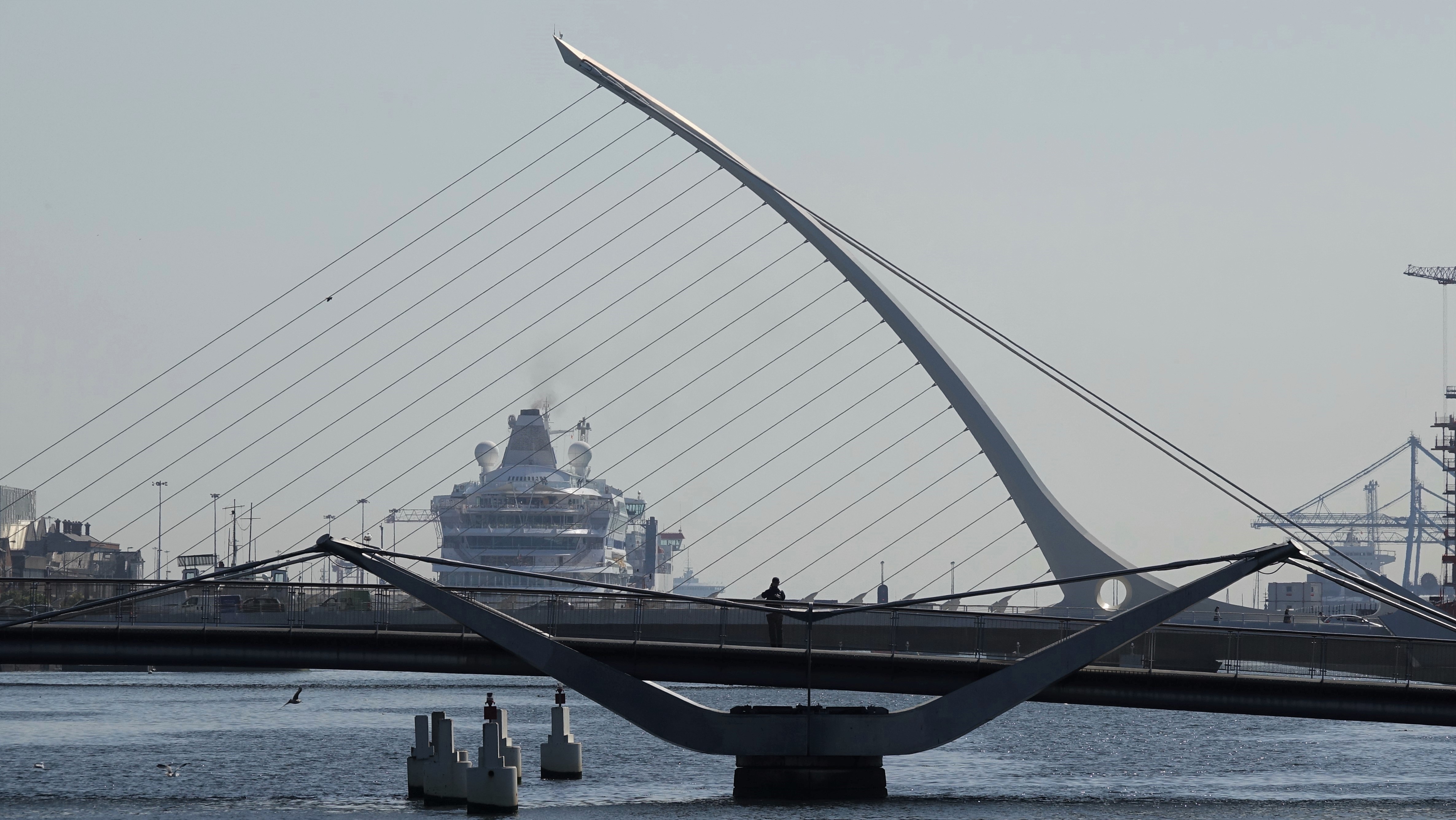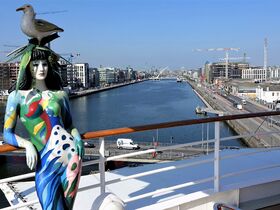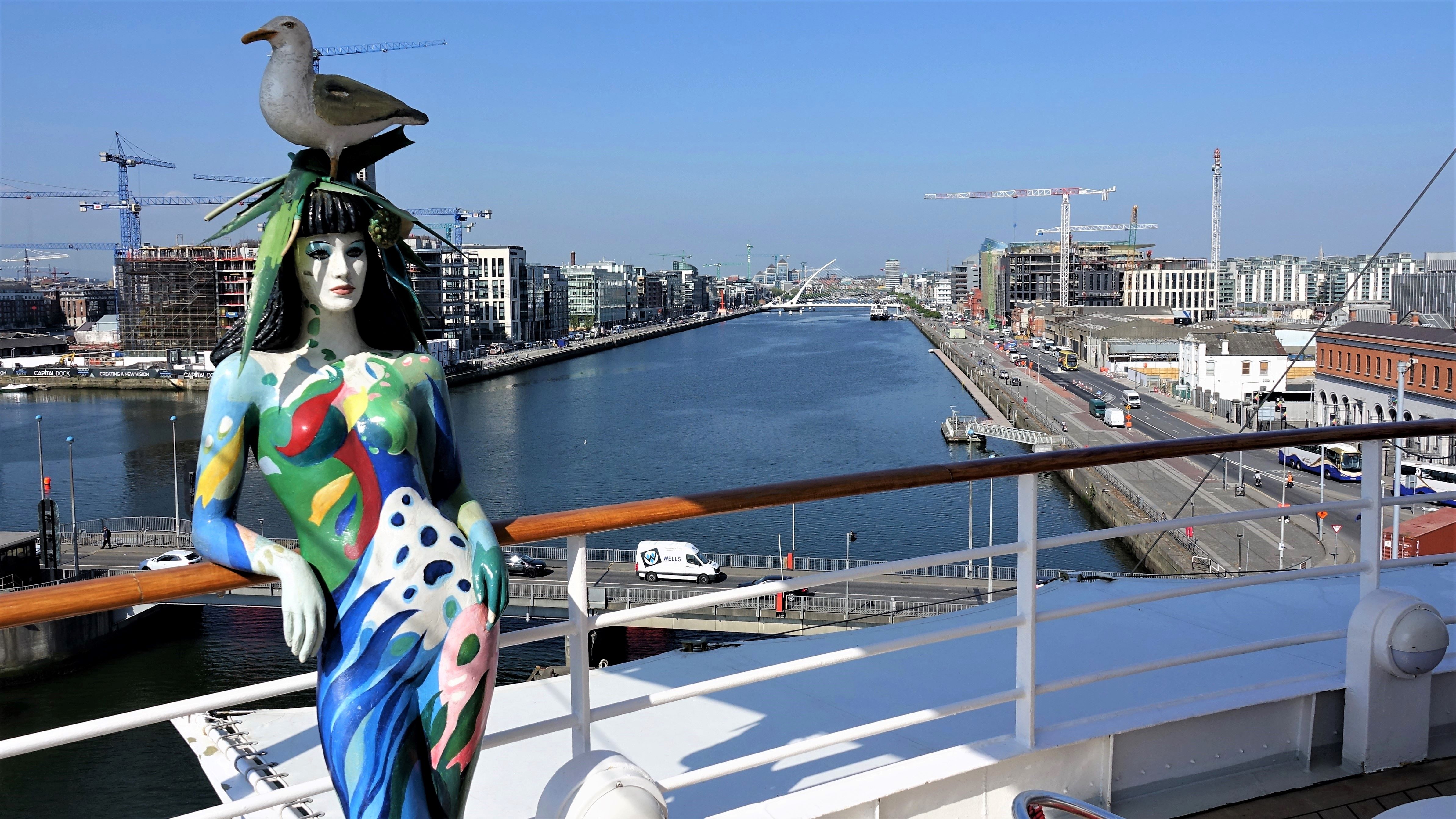 Bei aller schönstem Wetter fahren wir die Liffey nur ein kleines Stück hoch, bevor uns die unscheinbare „Tom Clarke Bridge“ zum Anlegen am nördlichen Ufer zwingt. Nach dem Frühstück erklimmen wir erst einmal zwecks Orientierung Deck 10. Links und rechts des Flusses wird in den Dublin Docklands immer noch viel gebaut und es erinnert uns sehr an die Bauaktivitäten in der Hafencity unserer Heimatstadt.