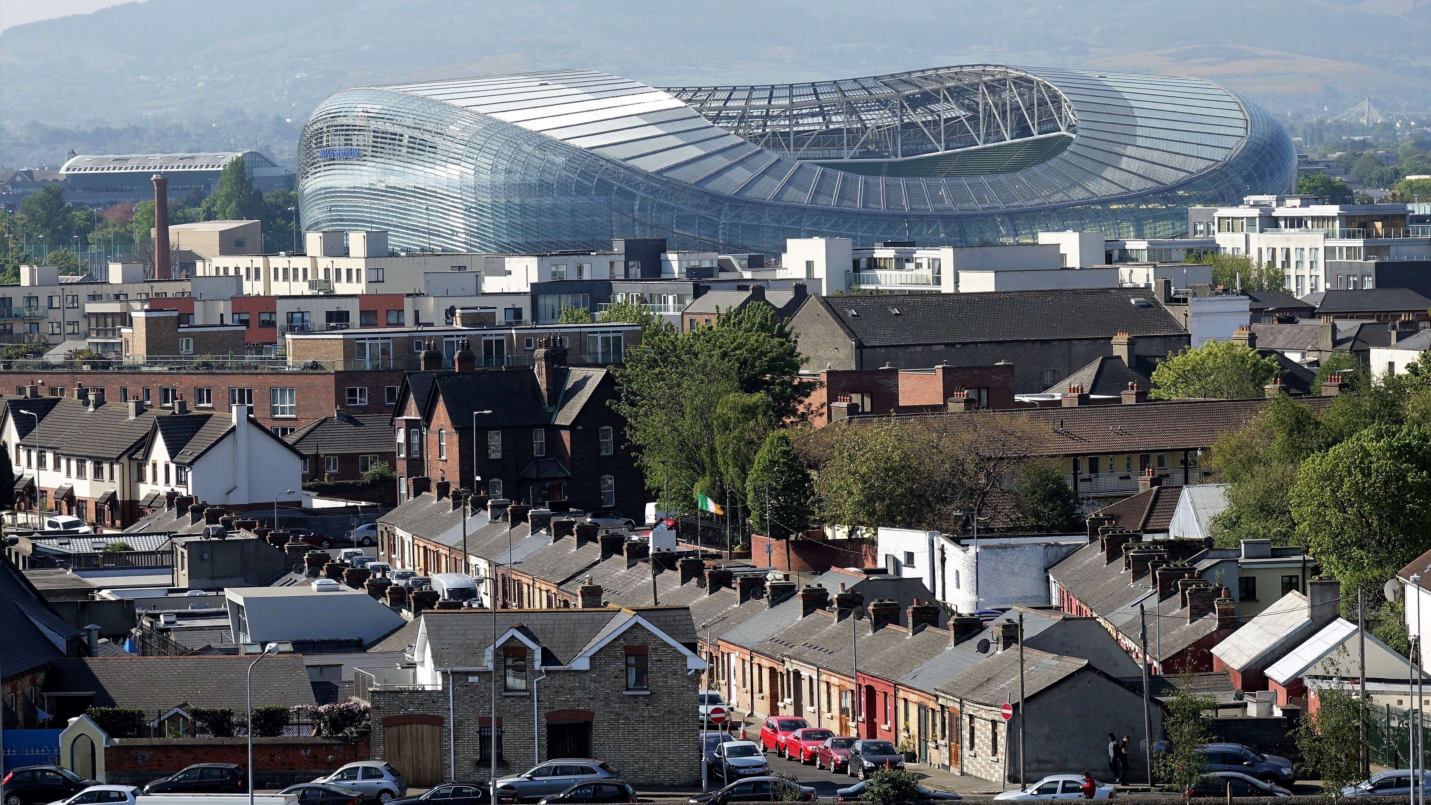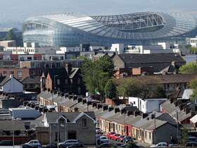Auf der südlichen Seite sehen wir das neue „Aviva Stadium“, das sich im gemeinsamen Besitz der Irish Rudby Football Union und der Football Association befindet. Hier tragen die Rudby- und die Fußball-Nationalmannschaft Irlands ihre Heimspiele aus. Eröffnet wurde das Stadion am 4. August 2010 mit einer 1:7 Niederlage einer Auswahl der irischen Liga gegen Manchester United.