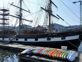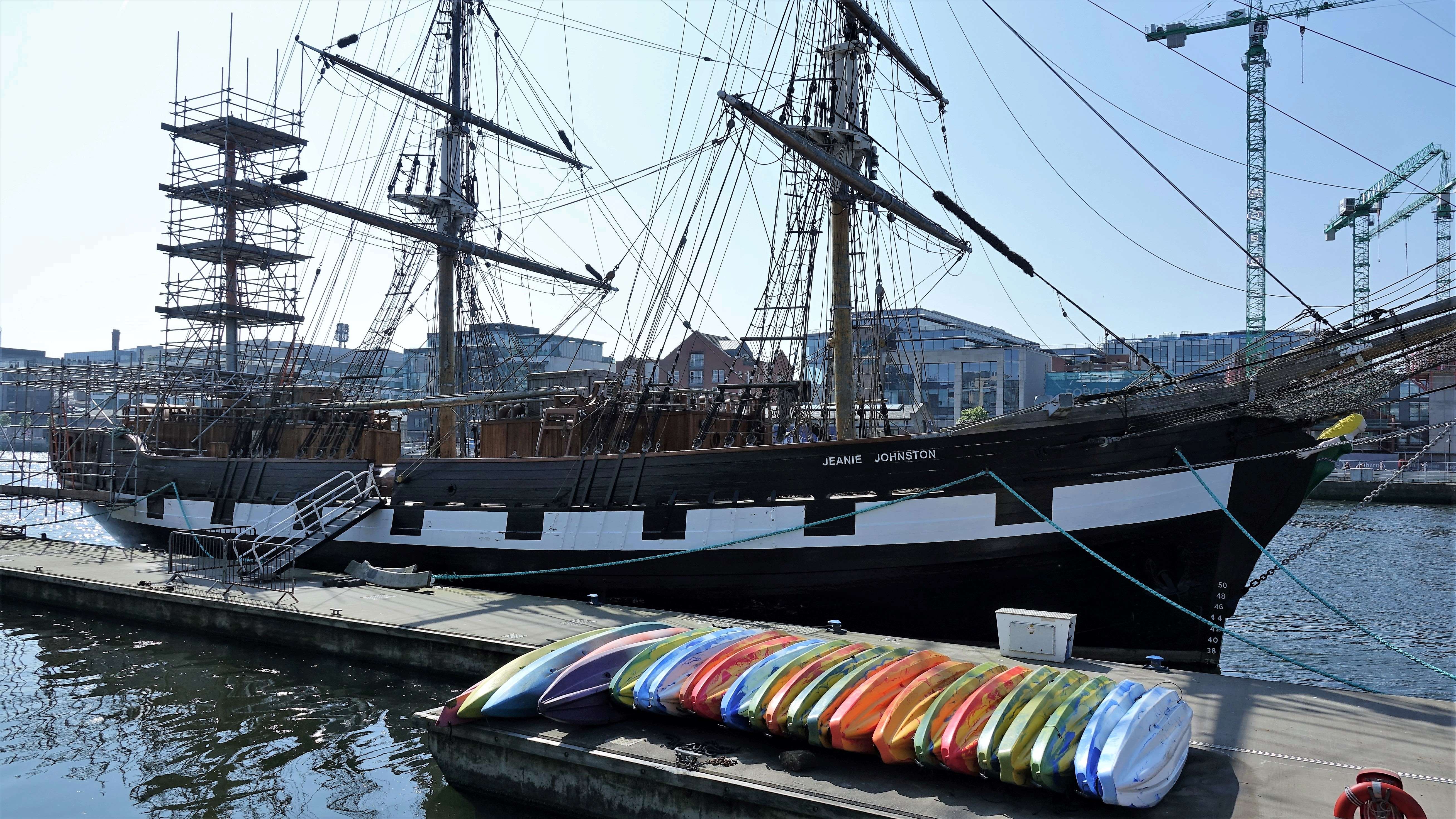 Ein Stückchen weiter flussaufwärts liegt am Ufer festvertäut die Replik der Dreimastbark „Jeanie Johnston“. Hier im Hafen dient sie als lebendiges Geschichtsmuseum der Auswanderung aus dem 19. Jh. und auf See ist sie ein seetüchtiges Segelschulschiff, das ab Mai 2000 für 13,6 Millionen gebaut wurde und im März 2003 auf Jungfernfahrt ging. Die ursprüngliche „Jeanie Johnston“ unternahm zwischen 1848 und 1855 sechzehn im Durchschnitt 47-tägige transatlantische Reisen: Auswanderer nach Nordamerika und auf der Rückfahrt Holz nach Europa. Dabei beförderte sie bis zu 254 Passagiere ohne jemals ein Menschenleben zu verlieren. Heute ist das Schiff für maximal 40 Personen zugelassen.