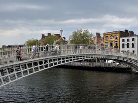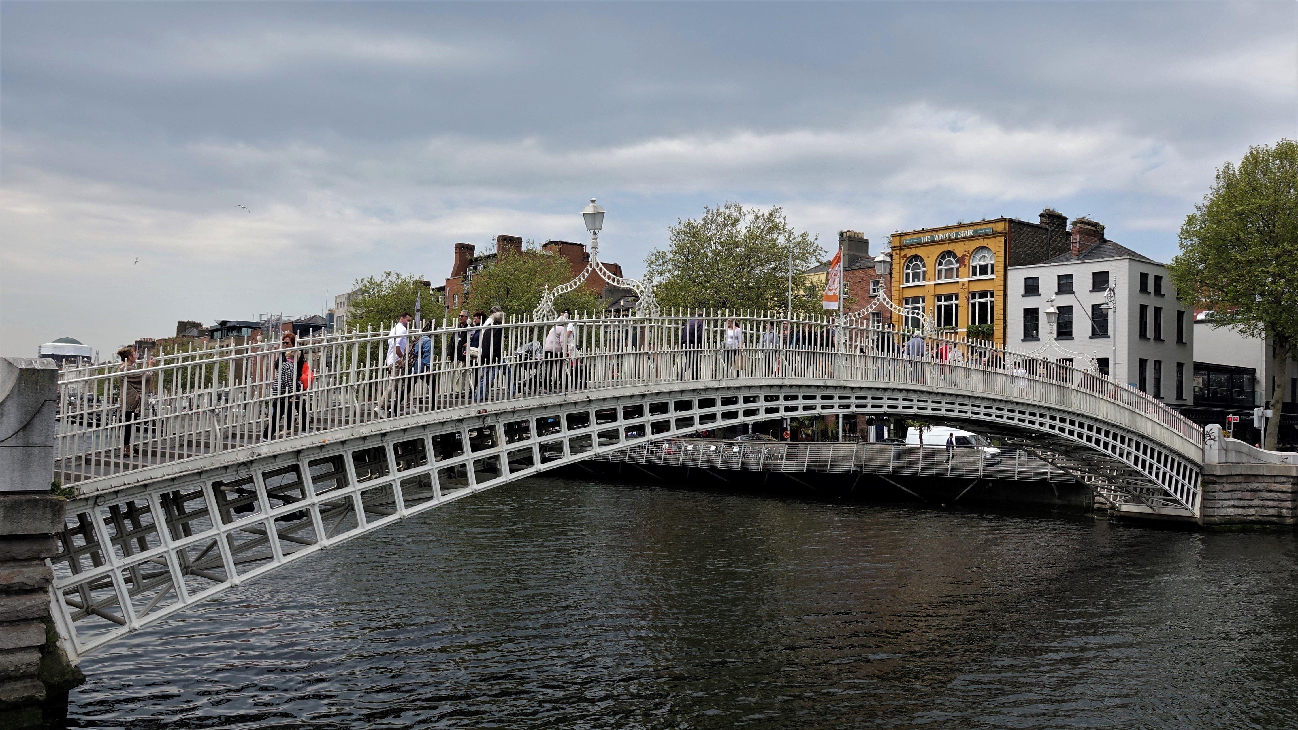 Über die „Ha‘ Penny Bridge“, eine 43 Meter lange und 3,7 Meter breite schmiedeeiserne Fußgängerbrücke, geht’s wieder aufs Nordufer. Ihren volkstümlichen Namen erhielt die aus dem Jahre 1816 stammende Brücke aufgrund der bis 1919 zu entrichtenden Fußgängermaut, die dem früheren Fährpreis in Höhe eines halben Penny entsprach.