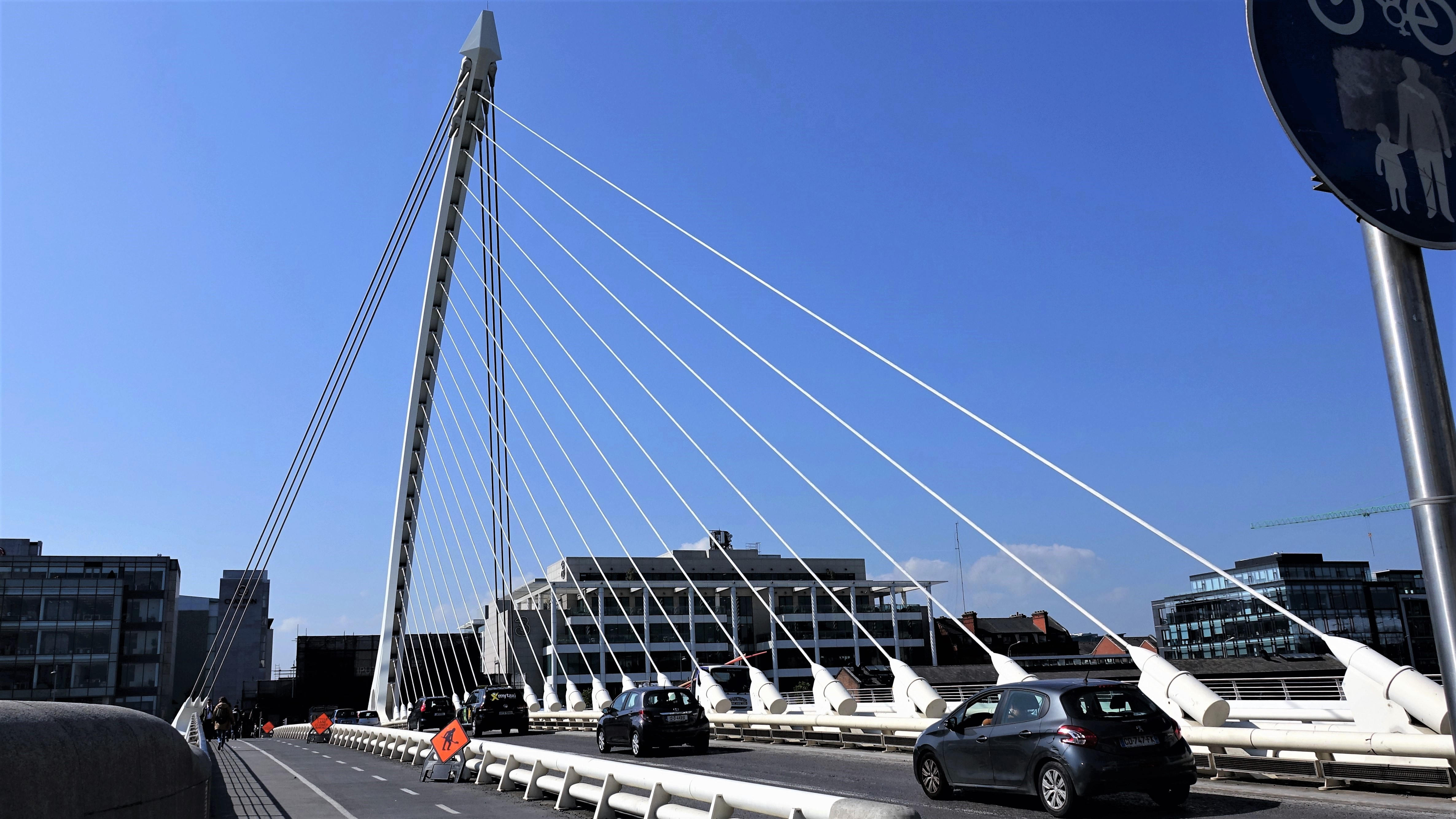 Die zweite Brücke, die die Liffey überspannt, ist die „Samuel Beckett Bridge“, eine 48 Meter hohe Schrägseilkonstruktion, die an eine liegende Harfe erinnert. Die Harfe ist ein bekanntes Wahrzeichen Irlands und ist auch auf der Euro Münze zu finden. Durch die Asymmetrie der Brücke kann sie auf einem Fundament gelagert werden und ist um 90 Grad schwenkbar, so dass genügend Platz für durchfahrende Schiffe bleibt.