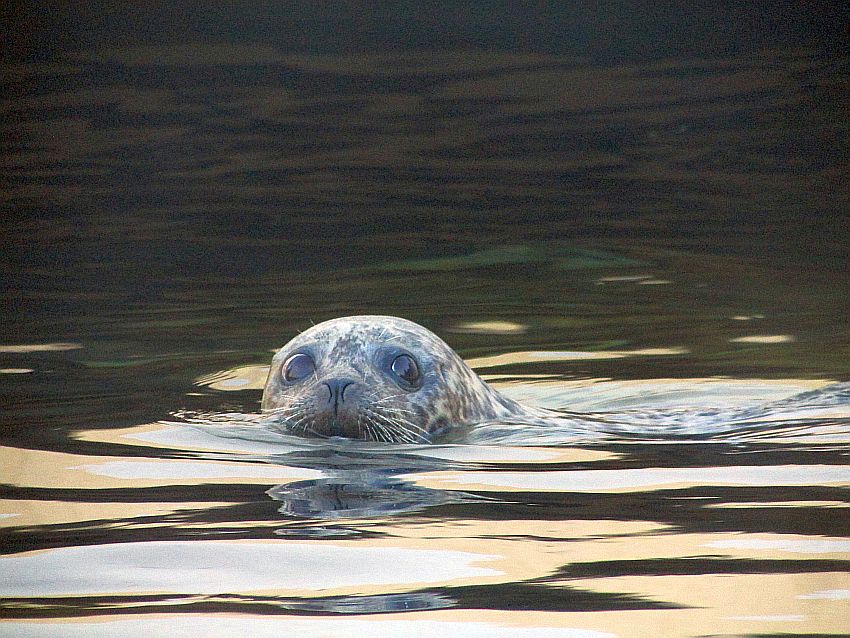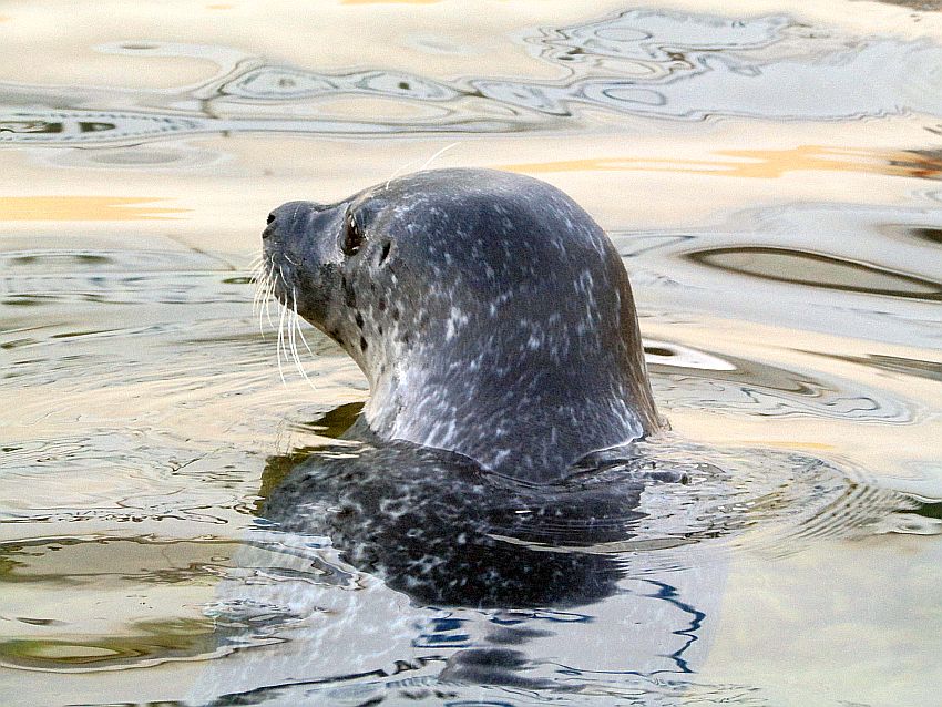 Wir kommen am Aquarium GEOMAR vorbei und schauen kurz, ob sich die Seehunde heute Abend noch zeigen. Und tatsächlich: Wir sehen sie! Wie schön! Ich mag diese putzigen Tiere, bewundere die pfeilschnelle Geschwindigkeit, die sie in ihrem Element - dem Wasser - zurücklegen können.