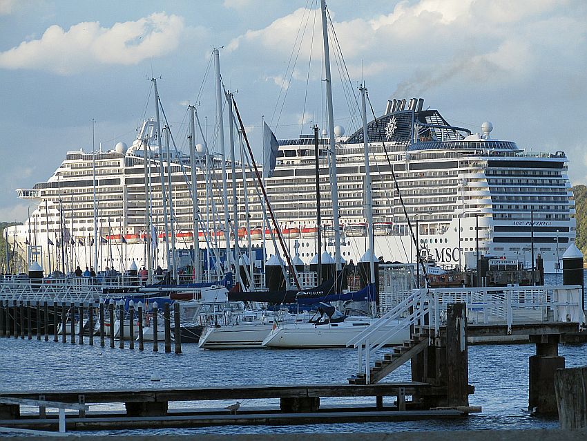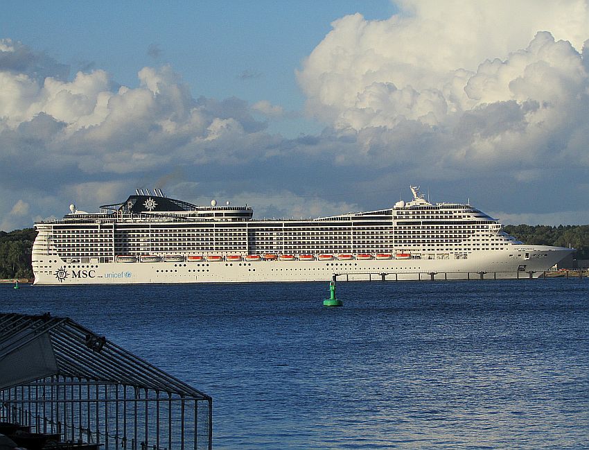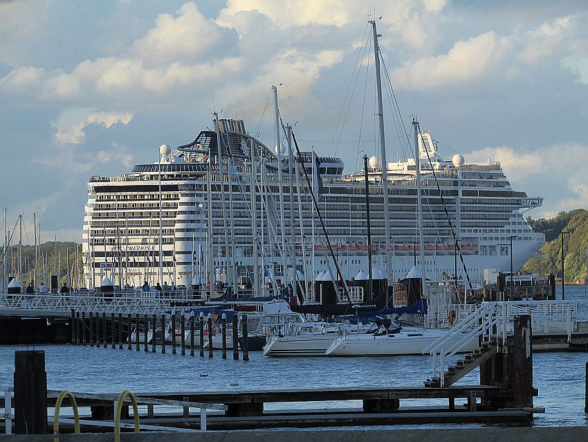 Als wir unsere Blicke von den kleinen Seehunden abwenden, bemerken wir, dass sich hinter uns mittlerweile etwas Großes in Bewegung gesetzt hat … Etwas ganz Großes … Und momentan auch noch relativ langsam: Der Kreuzfahrtkoloss "MSC Preziosa" schickt sich an, seinen doch etwas im Abseits befindlichen Liegeplatz am Ostuferkai wieder sich selbst zu überlassen. Und erstmals kann ich einen ungehinderten Blick auf die volle Größe dieses Potts werfen. Einfach nur: WOW! Zwar bin ich zwischenzeitlich auch schon mit AIDAprima gereist, aber diese "Insel der Glückseligen" ist abermals 33 Meter länger.