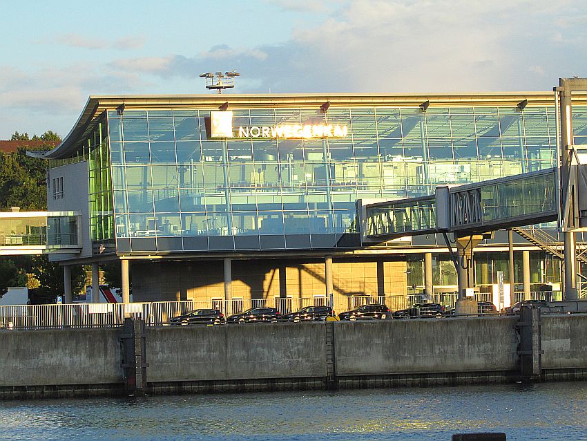 Hinter einem hohen Zaun strahlen die getönten Scheiben des Abfertigungsgebäudes am Nowegenkai mit der sinkenden Sommersonne um die Wette. Ein toller Anblick.