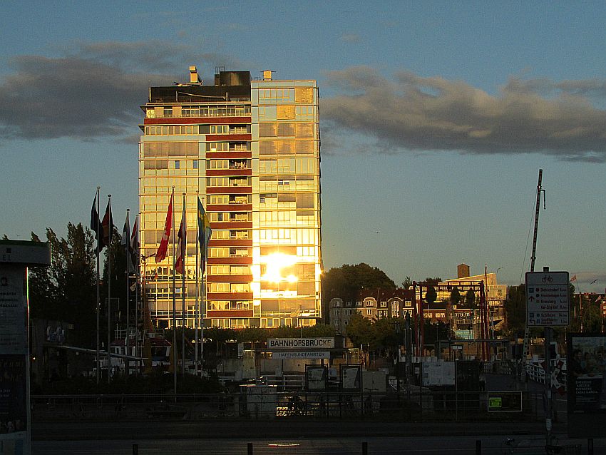 Ich kann noch nicht sofort in mein Hotel zurückkehren. Nach dem Erlebten muss ich erst einmal tief durchatmen und mich sammeln. So bummele ich nochmals in Richtung Bahnhofsbrücke oder vielmehr "Hörnbrücke". Jene Brücke, die in drei Glieder gefaltet werden kann, um größere Boote in den "Germaniahafen" oder aus Richtung desselbigen durchzulassen.