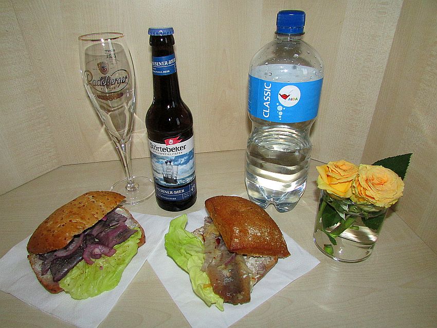 Der berühmte "kleine Hunger" erinnert mich daran, dass in den Tiefen meines Rucksacks ja noch mein maritimes Abendbrot wartet. Bismarckhering in Rotwein und Goldrauchmatjes warten darauf, im "Störtbeker"-Pils zu schwimmen, das ich etwas mische mit dem Mineralwasser aus meiner AIDA-Kabine. Dazu - wegen des schöneren Ambientes - zwei gelbe Rosenblüten, die ich mir aus meinem bis zum letzten Tag an Bord noch frischen Kabinenblumenstrauß aus dem "Blütenmeer" mitgenommen habe.