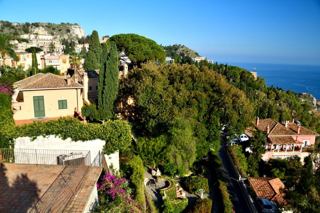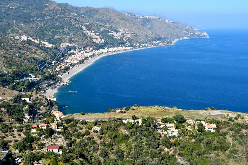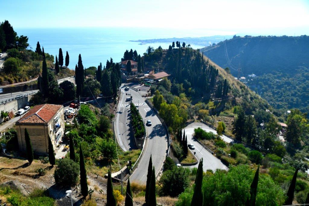 Endlich sahen wir wieder das Meer. Tiefblau. Noch weit unten. Also noch viele Serpentinen und Überraschungen, die nach den folgenden Kurven auf uns warteten. Eine Fahrt kreuz und quer durch die Landschaft; irgendwie erschien uns die Fahrt unstrukturiert. Doch Guiseppe wusste, was er tat. Er kannte sich im Gegensatz zu uns aus. Und wir erreichten die Autobahn. Aus unserem vorher sehr langsam und vorsichtig fahrenden Guiseppe wurde ein echter Italiener (Vorurteil?). Turbo, wo es eben ging; aber vorausschauend. Gut, dass wir am Vormittag nach unserem ersten Fotostopp die nicht belegten Behindertenplätze eingenommen hatten. So sahen wir auf einmal durch die riesige Frontscheibe weit vor uns zwei sich auf Bergkuppen klammernde Dörfer. Eins war unser Ziel: Taormina. Bis wir es erreichten, verging noch einige Zeit. Wie an diesem Tag gewohnt eine kurvenreiche Fahrt