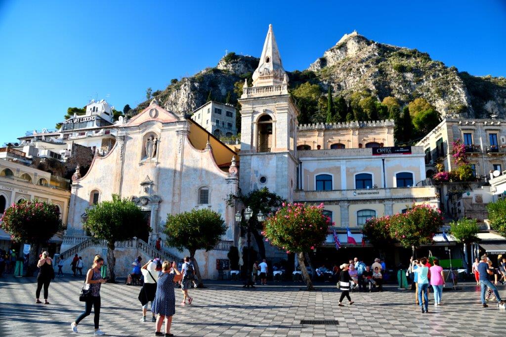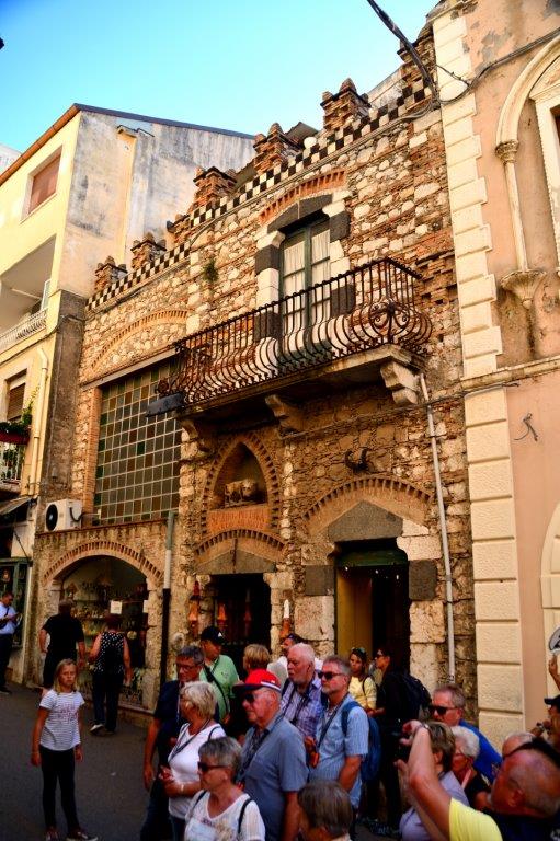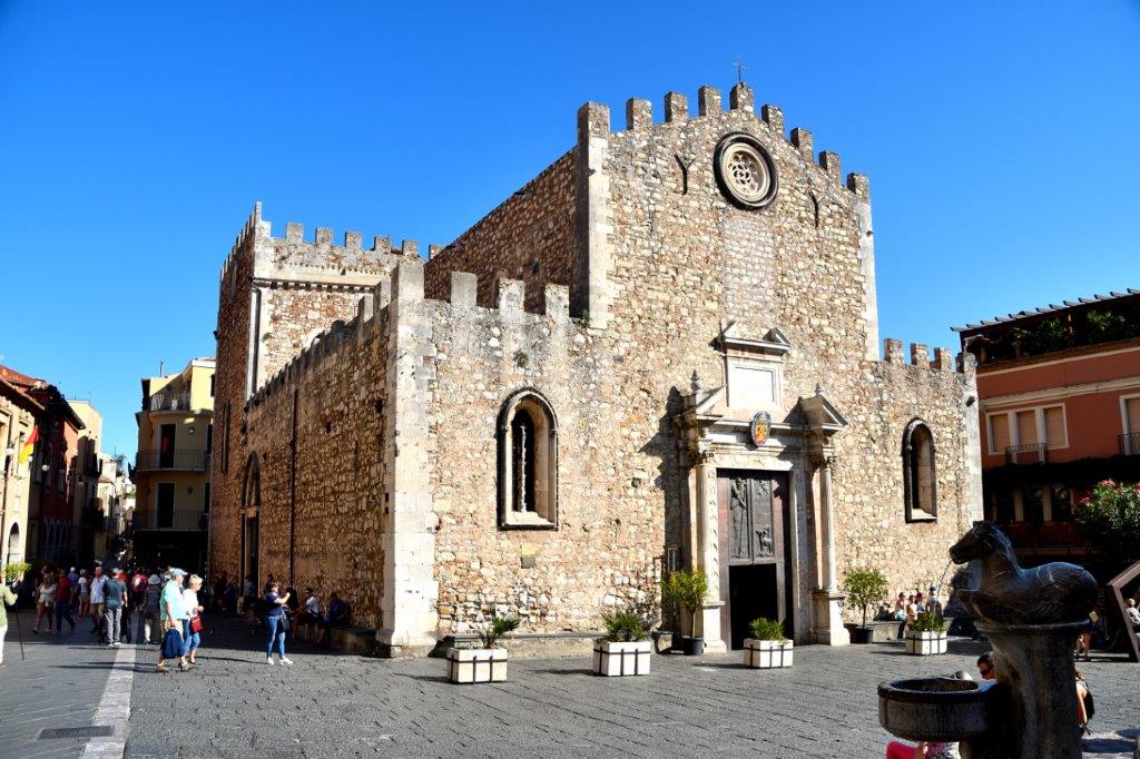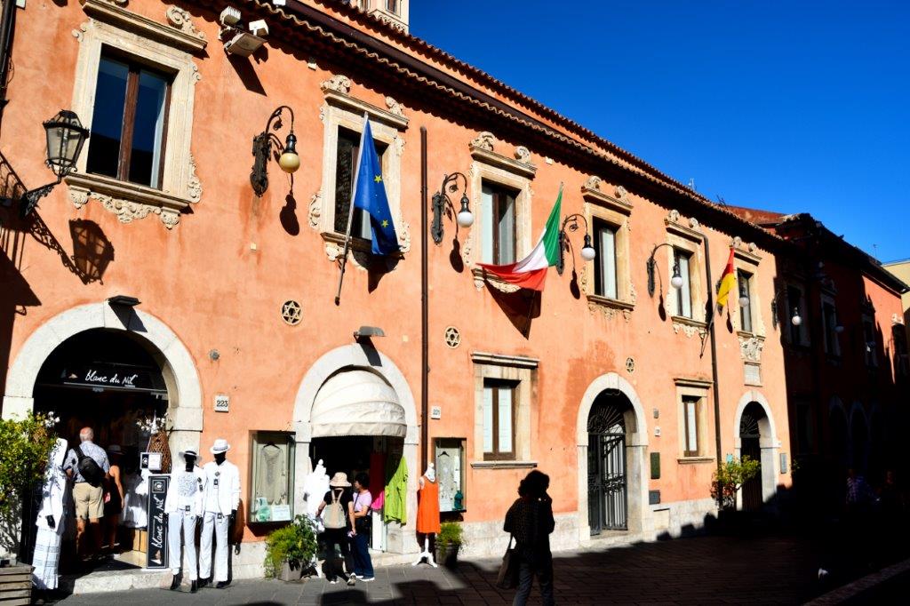 Ja, Taormina hatte einiges zu bieten. Tief unter uns und auch oben in der Altstadt. Was dort Tausende, nein, über Jahre hinweg Millionen faszinierte, wollten wir uns anschauen. Und tatsächlich – vom Theater aus schafften wir es, durch das stetige Gedränge bis zur Prachtstraße Corso Umberto I, benannt nach dem zweiten Herrscher des geeinten Königreichs Italien, zu stoßen. Dort, an der Piazza Vittorio Emanuelle, benannt nach dem ersten König, standen zwei imposante Gebäude. Der Palazzo Corvaja, der schönste, in vorwiegend gotischem Stil erbaute Stadtpalast von einer der ältesten Adelsfamilien von Taormina. Im heute lauschigen Innenhof tagte 1410 das sizilianische Parlament.