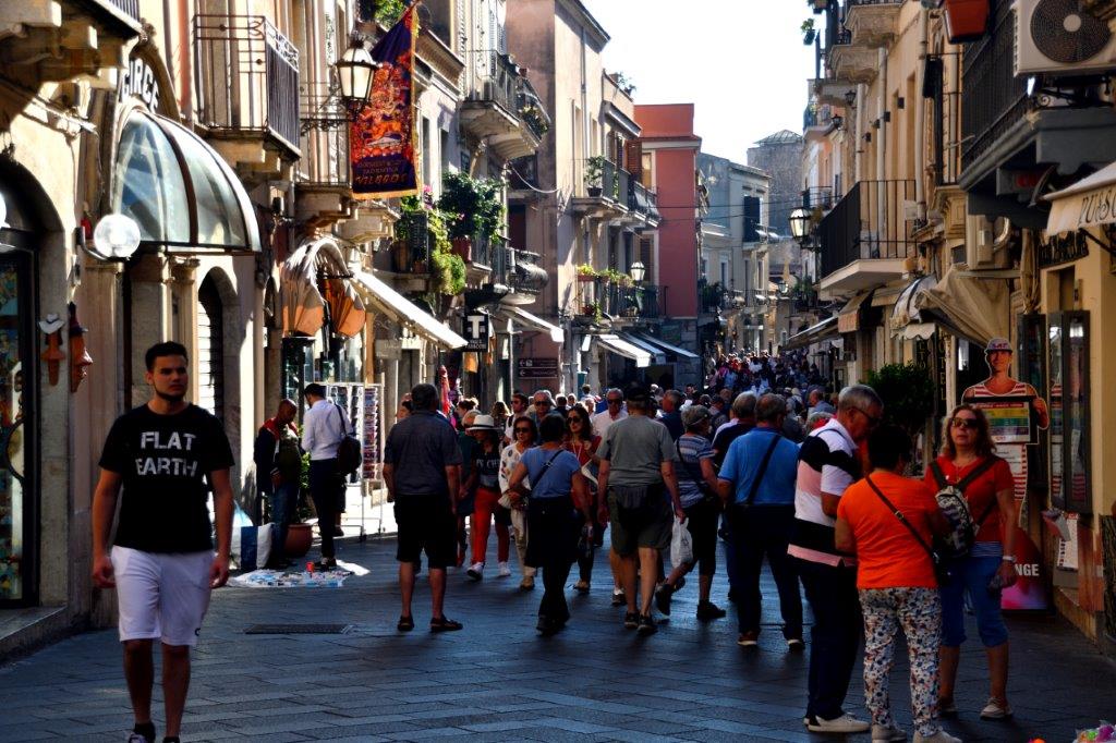 bis wir das Parkhaus unterhalb des Zentrums erreichten. Um unsere Waden zu schonen, fuhren wir mit dem Aufzug von Ebene 1 auf 7. Oben angekommen gab Laura einen kurzen Überblick und führte uns durch die Gassen zum griechisch-römischen Theater. Es ging nur langsam voran. Am Ätna wimmelte es von Touristen; Taormina war die Steigerung.