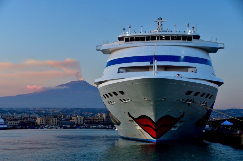 Vor dem Entern der AIDAcara mussten wir sie mit dem Ätna im Hintergrund festhalten. Dort oben war es inzwischen stürmisch …