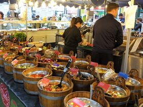 Und natürlich mit jeder Menge an Essensständen, wo die einladenden Gerüche mich fast überwältigen. Fast. Da wir im Prinzip gerade vom Frühstück kommen, werden alle meine kulinarischen Gelüste von meiner Mitreisenden im Keim erstickt. Aber nach einem anderen Prinzip, hätte man doch wenigstens probieren können. Ist schon nicht einfach so ein Leben, wenn die Kalorien an jeder Ecke lauern und einen verführen wollen.