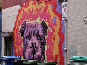 In einer Seitenstraße sehen wir ein Graffiti von einem Hund, dem ich nicht unbedingt in natura begegnen möchte.