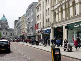 Nebenan am Donegall Place befindet sich ein Schuhladen von Clarks. Nun sind die beiden weiblichen Mitglieder unserer Truppe nicht mehr zu halten. Am Ende der Straße sehen wir wieder das Rathaus, so dass sich der erste Kreis hier schließt.