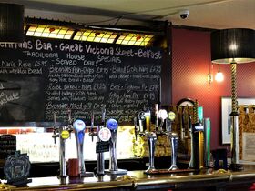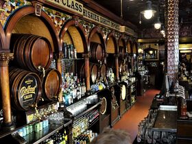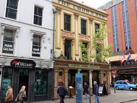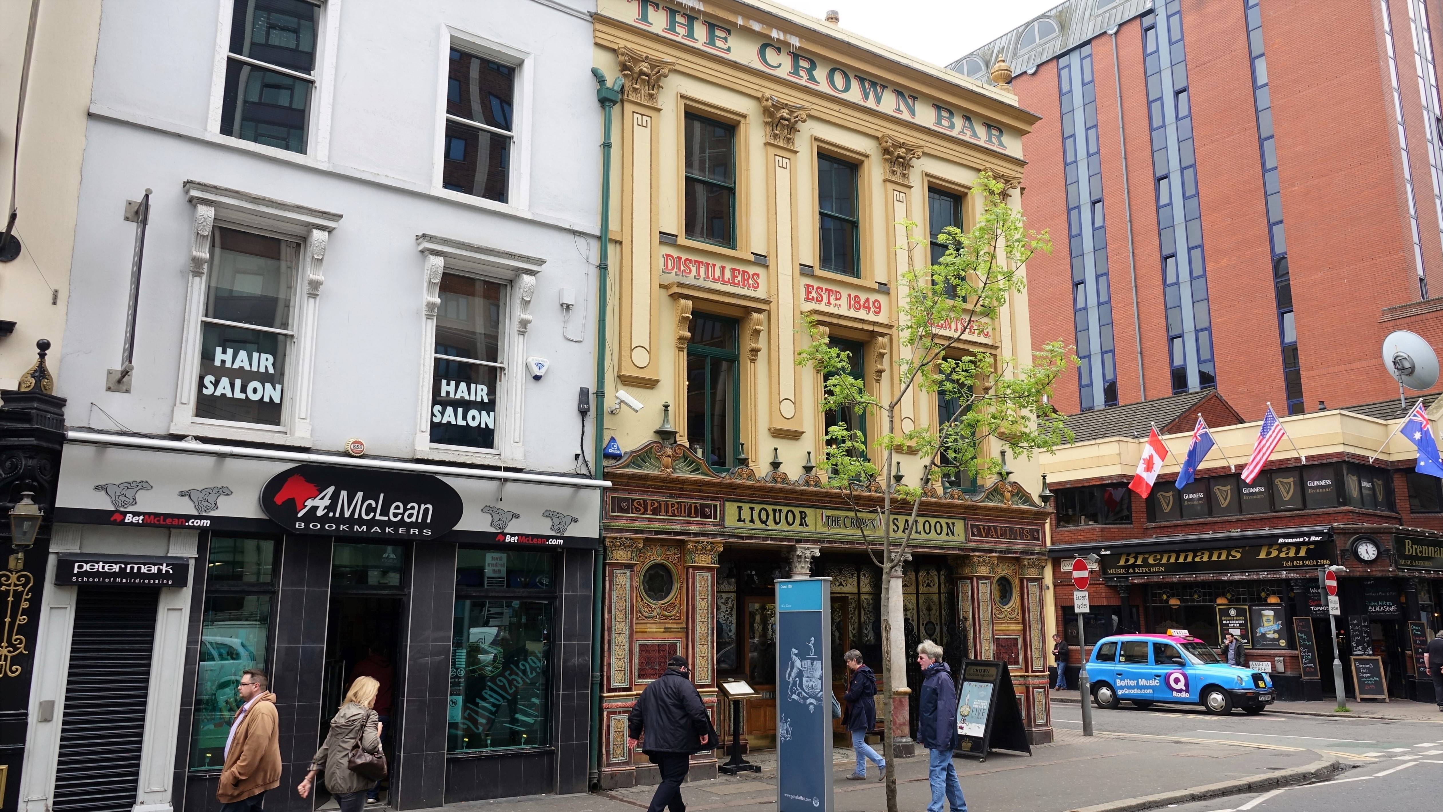 Und dann ist da noch die Pubkultur. Der „Crown Liquor Saloon“, der 1826 in einem luxuriösen Barockstil erbaut wurde, ist der älteste Pub Nordirlands und befindet sich auf der anderen Straßenseite in unmittelbarer Nähe. Er verdankt seine kunstvollen Fliesen, Glasmalereien und geschnitzten Holzvertäfelungen italienischen Handwerkern, die zum Kirchenbau nach Belfast geholt worden waren. Der „Crown Liquor Saloon“ war einer der schönsten viktorianischen Gin-Paläste seiner Zeit. Also ist es kein Wunder, dass wir als ausgewiesene Kunstkenner ins Schwärmen geraten. Leider gibt es in den mit buntem Glas verzierten Séparées, den „Snugs“, die durch halbhohe Wände voneinander getrennt sind und auf weichen Ledersitzen dem unerkannten Verzehr dienen, keinen Platz für uns.