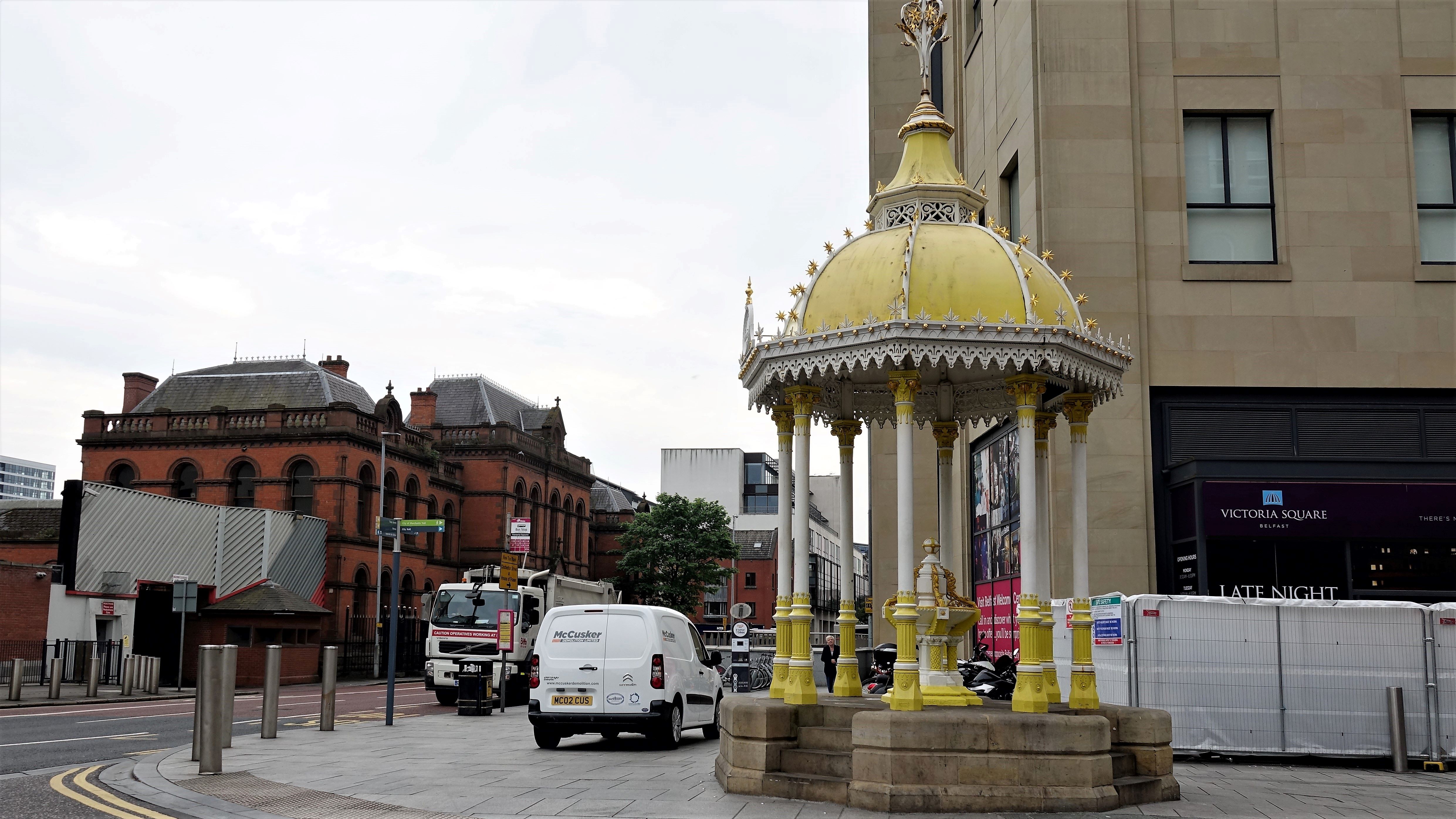 Davor steht der Trinkbrunnen „Jaffe Memorial Fountain“, der an den 1809 in Schwerin geborenen jüdischen Geschäftsmann, Politiker und Philanthropen erinnert. Daniel Joseph Jaffe gründete die Firma Gebrüder Jaffe, die in Hamburg, Dundee, Belfast, Leipzig und Paris Geschäftssitze unterhielt und die hier in Ulster den Leinenhandel, einen wesentlichen Wirtschaftsfaktor der Region, förderte. Die Leinenindustrie war im 17. Jh. von den aus Frankreich vertriebenen Hugenotten aufgebaut worden.