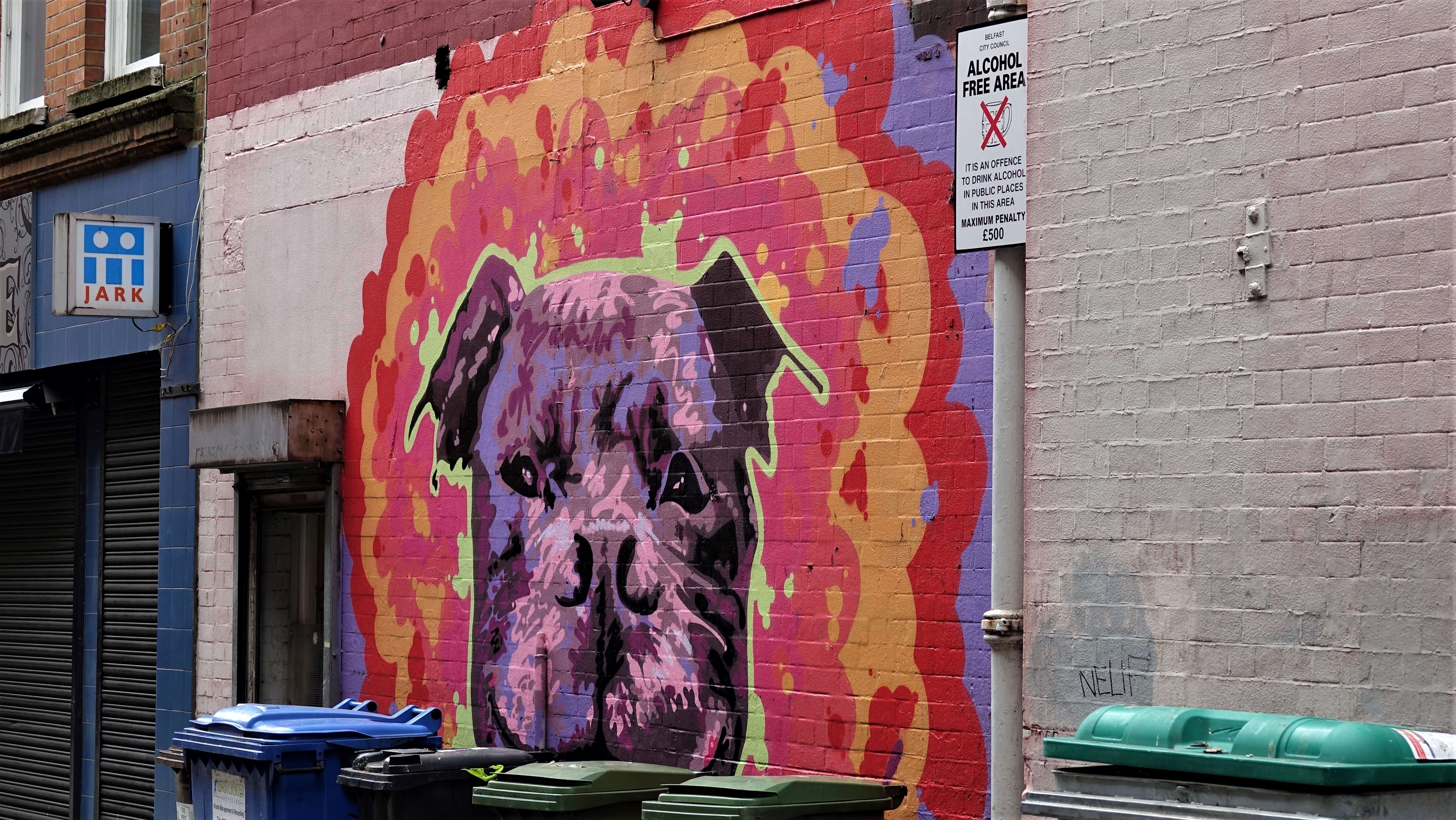 In einer Seitenstraße sehen wir ein Graffiti von einem Hund, dem ich nicht unbedingt in natura begegnen möchte.
