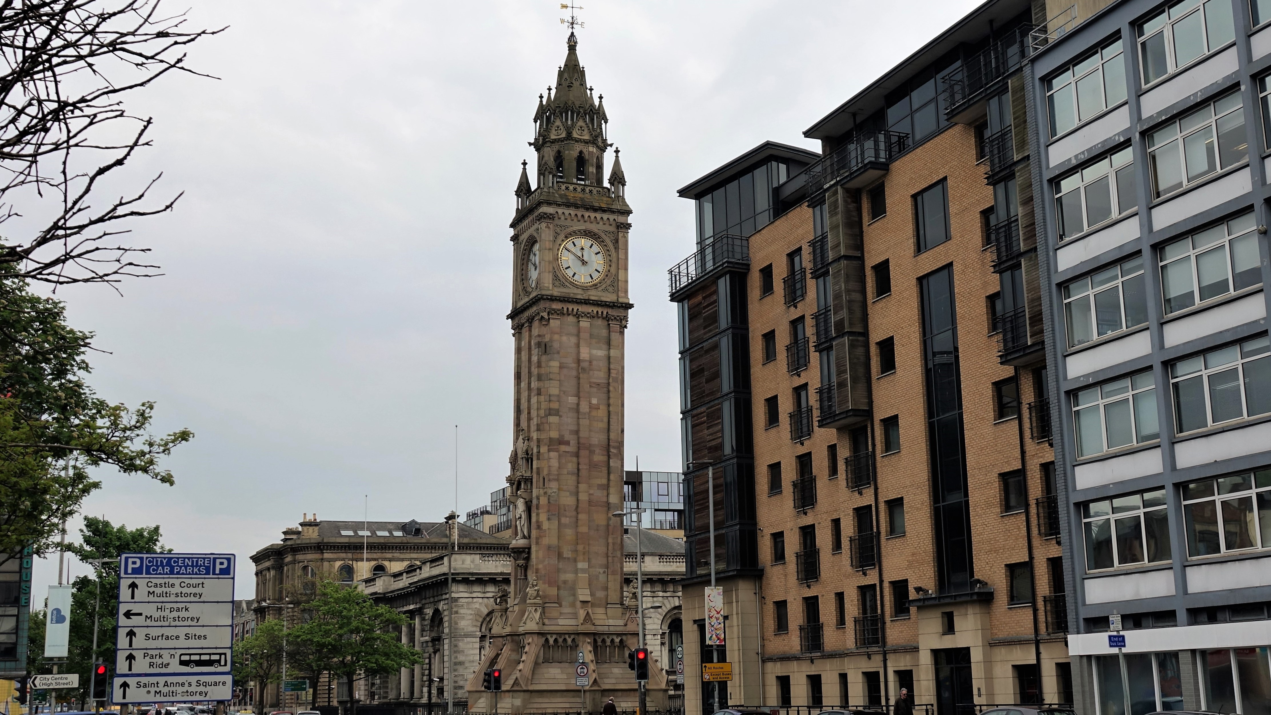 Wir folgen der Victoria Street bis zur Ecke High Street, wo auf der anderen Seite am Queen’s Square die „Albert Memorial Clock“ steht, Belfasts Antwort auf den „Schiefen Turm von Pisa“. Die Turmuhr wurde 1865 zu Ehren von Prinz Albert, dem verstorbenen Prinzgemahl der damaligen englischen König Victoria, errichtet, leider aber auf trockengelegtem Marschland, so dass sich der Turm auf dem wenig stabilen Untergrund immer mehr neigte und schließlich um mehr als einen Meter von der Lotrechten abwich. 2002 wurde die Uhr renoviert und die Neigung gestoppt.