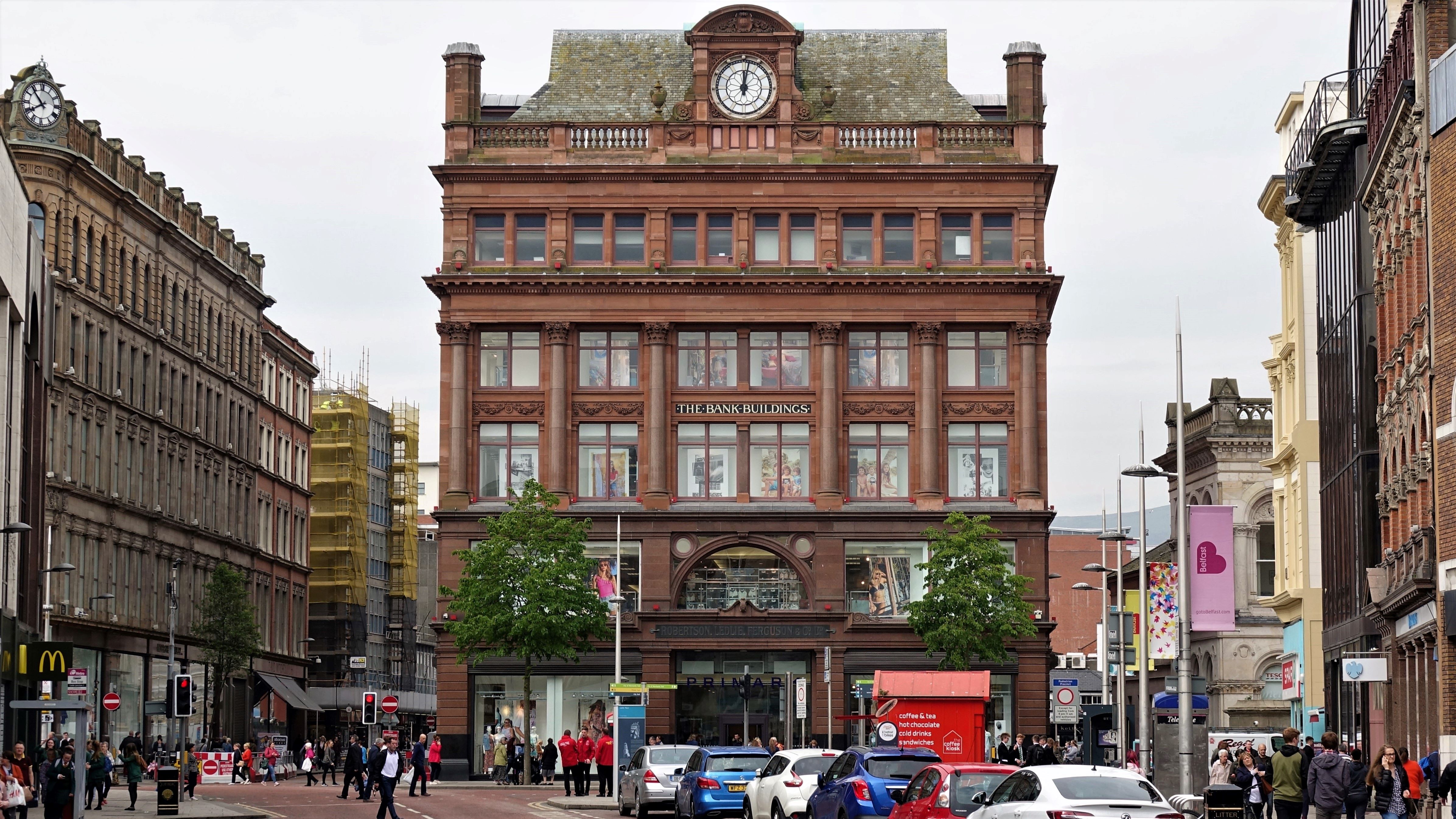 Wir biegen ab in die High Street, die in den Castle Place übergeht, wo an der Ecke zum Donegall Place das imposante Gebäude „The Bank Buildings“ steht. Leider ist mein Bild vom 12. Mai 2017 ein historisches Foto, da das Gebäude am 28. August 2018 im Rahmen von Renovierungsarbeiten ziemlich stark zerstört werden wird. Die Wiederaufbauarbeiten werden noch bis mindestens 2022 andauern.