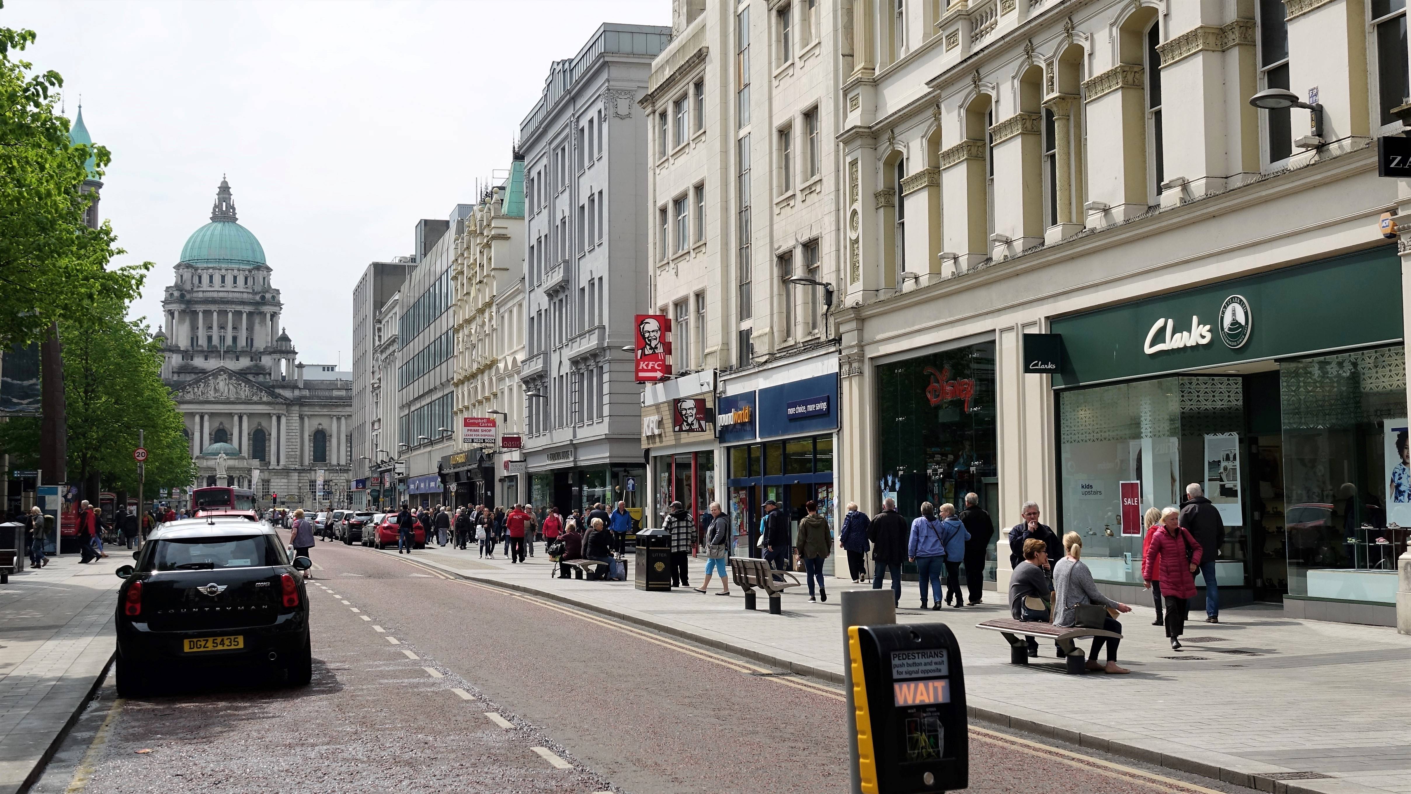 Nebenan am Donegall Place befindet sich ein Schuhladen von Clarks. Nun sind die beiden weiblichen Mitglieder unserer Truppe nicht mehr zu halten. Am Ende der Straße sehen wir wieder das Rathaus, so dass sich der erste Kreis hier schließt.
