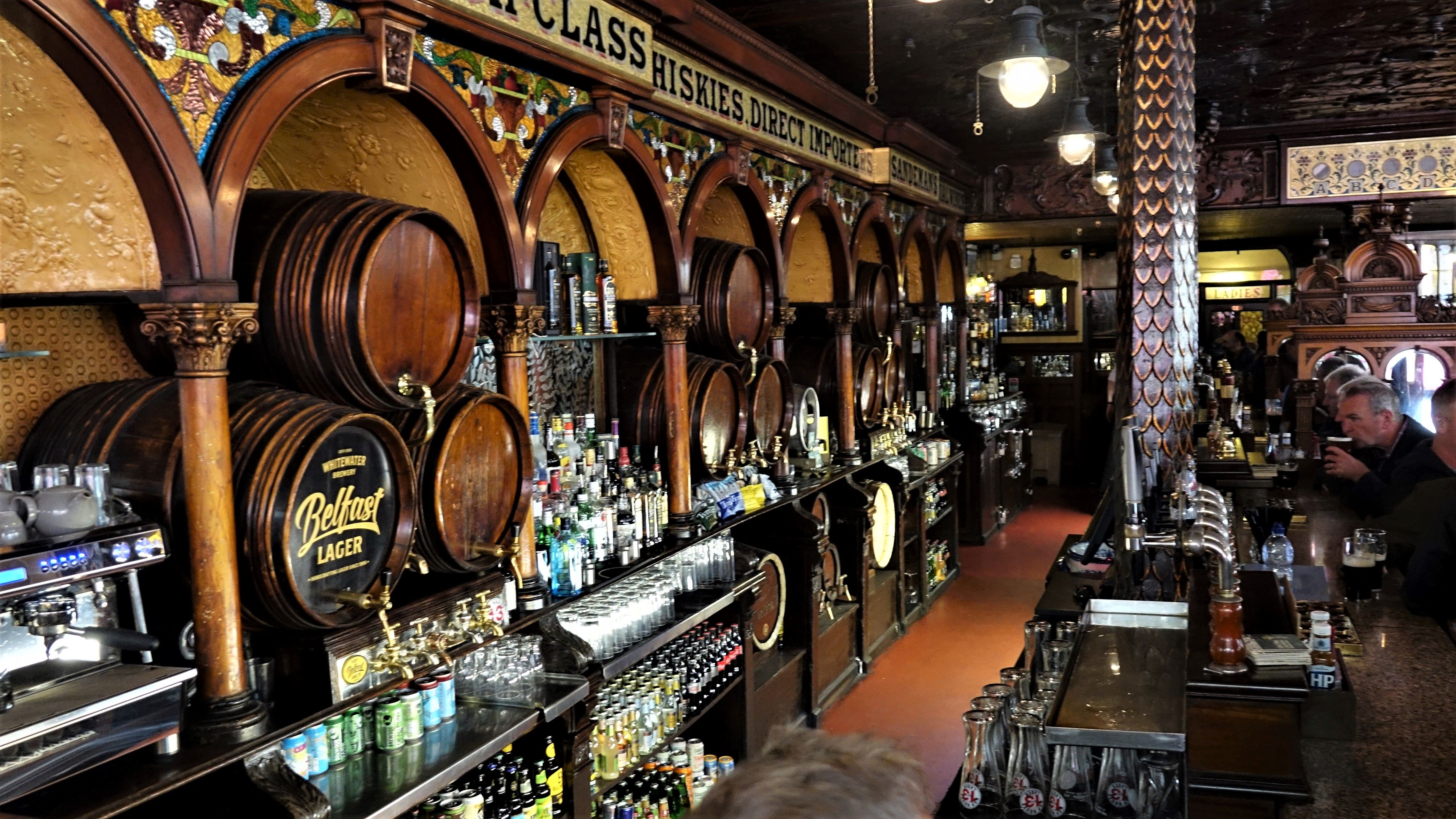 Und dann ist da noch die Pubkultur. Der „Crown Liquor Saloon“, der 1826 in einem luxuriösen Barockstil erbaut wurde, ist der älteste Pub Nordirlands und befindet sich auf der anderen Straßenseite in unmittelbarer Nähe. Er verdankt seine kunstvollen Fliesen, Glasmalereien und geschnitzten Holzvertäfelungen italienischen Handwerkern, die zum Kirchenbau nach Belfast geholt worden waren. Der „Crown Liquor Saloon“ war einer der schönsten viktorianischen Gin-Paläste seiner Zeit. Also ist es kein Wunder, dass wir als ausgewiesene Kunstkenner ins Schwärmen geraten. Leider gibt es in den mit buntem Glas verzierten Séparées, den „Snugs“, die durch halbhohe Wände voneinander getrennt sind und auf weichen Ledersitzen dem unerkannten Verzehr dienen, keinen Platz für uns.