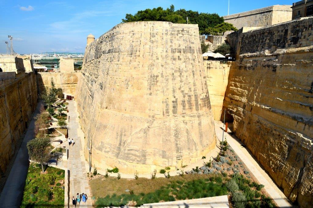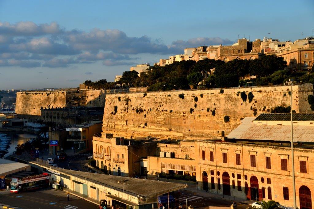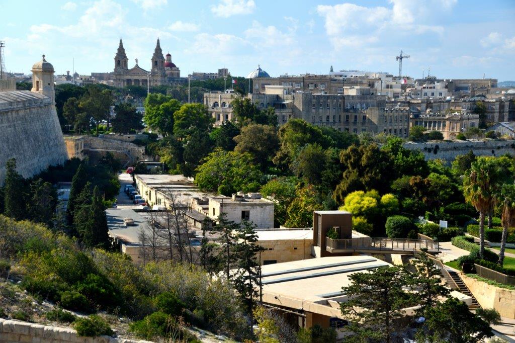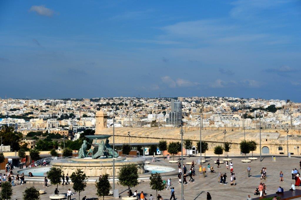 und auf Richtung Nordwest-Teil Vallettas. Vorbei an der mächtigen Stadtmauer mit der Zentralbank von Malta im Hintergrund und dann zunächst zum Aussichtspunkt Hastings Gardens. Natürlich nicht auf direktem Weg, denn unterwegs wurden wir immer wieder abgelenkt. So z.B. von dem Blick über den Triton Fountain Square mit dem Mittelpunkt Triton Brunnen über die mächtige Stadtmauer auf das jenseits des Marsamxett Harbour zu erkennenden Häusergewimmels.