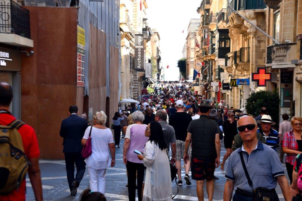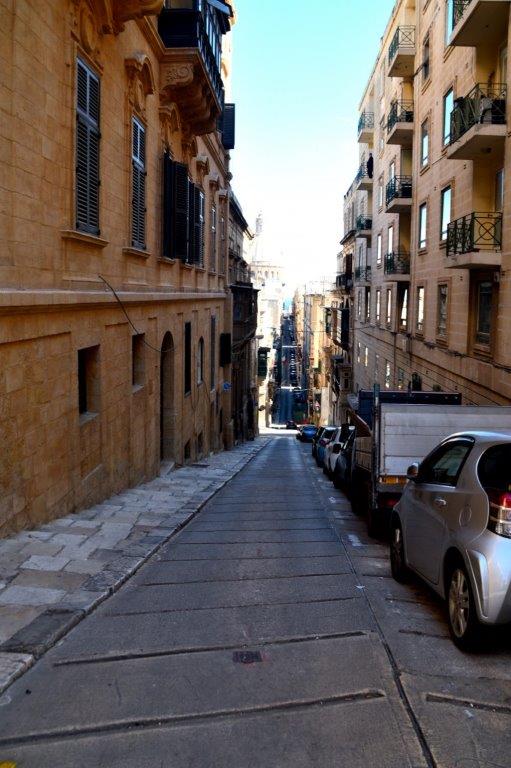 Eine lang gezogene enge, im Einbahnverkehr zu befahrene Gasse, die von der nordwestlichen Stadtmauer nach unten führte, ihren Scheitelpunkt in der Mittel der Altstadt hatte und dann wieder nach oben Richtung südöstlicher Stadtmauer oberhalb des Grand Harbour führte. Wie das Foto zeigt – nix los … Das änderte sich aber ganz schnell …