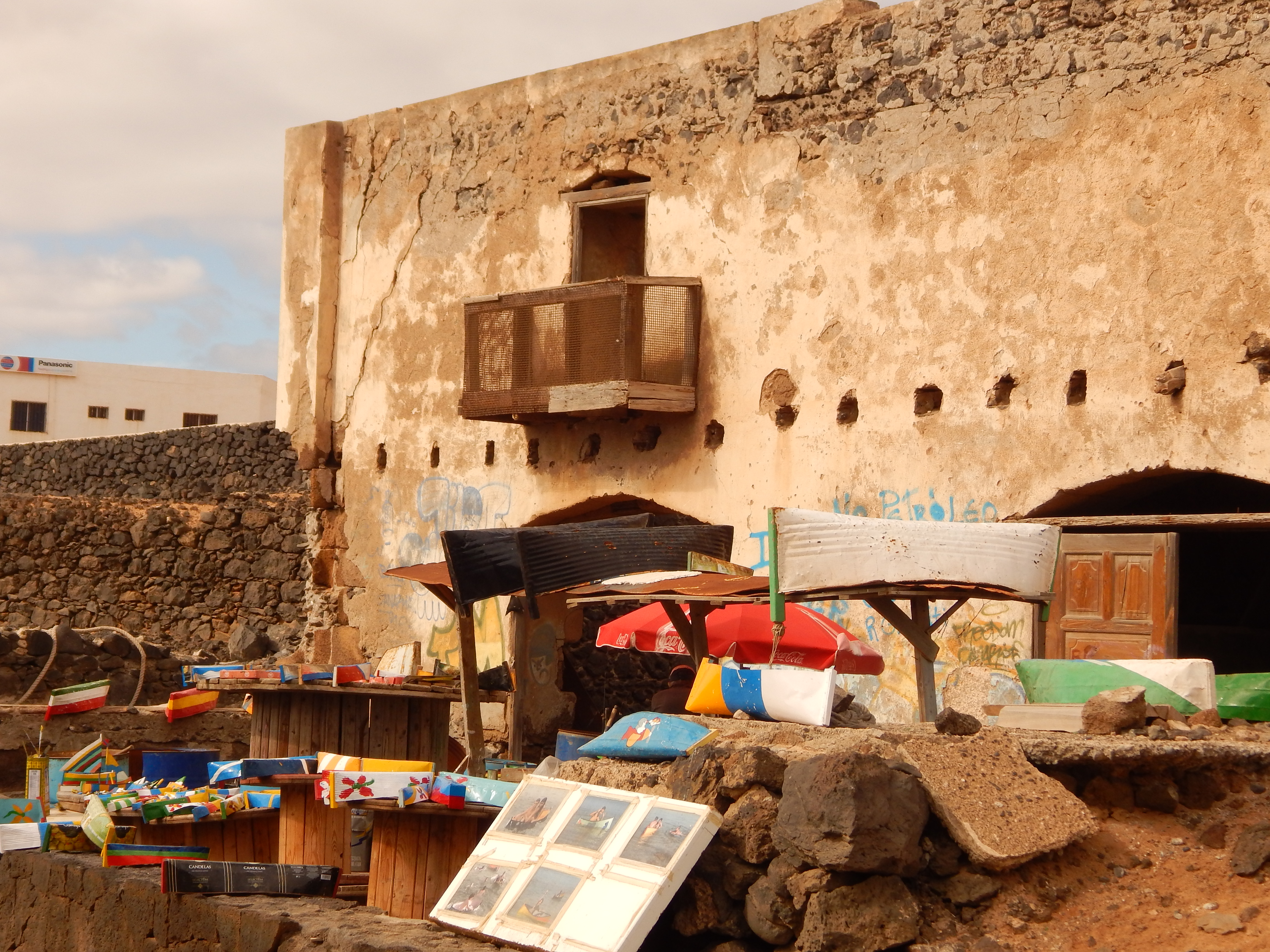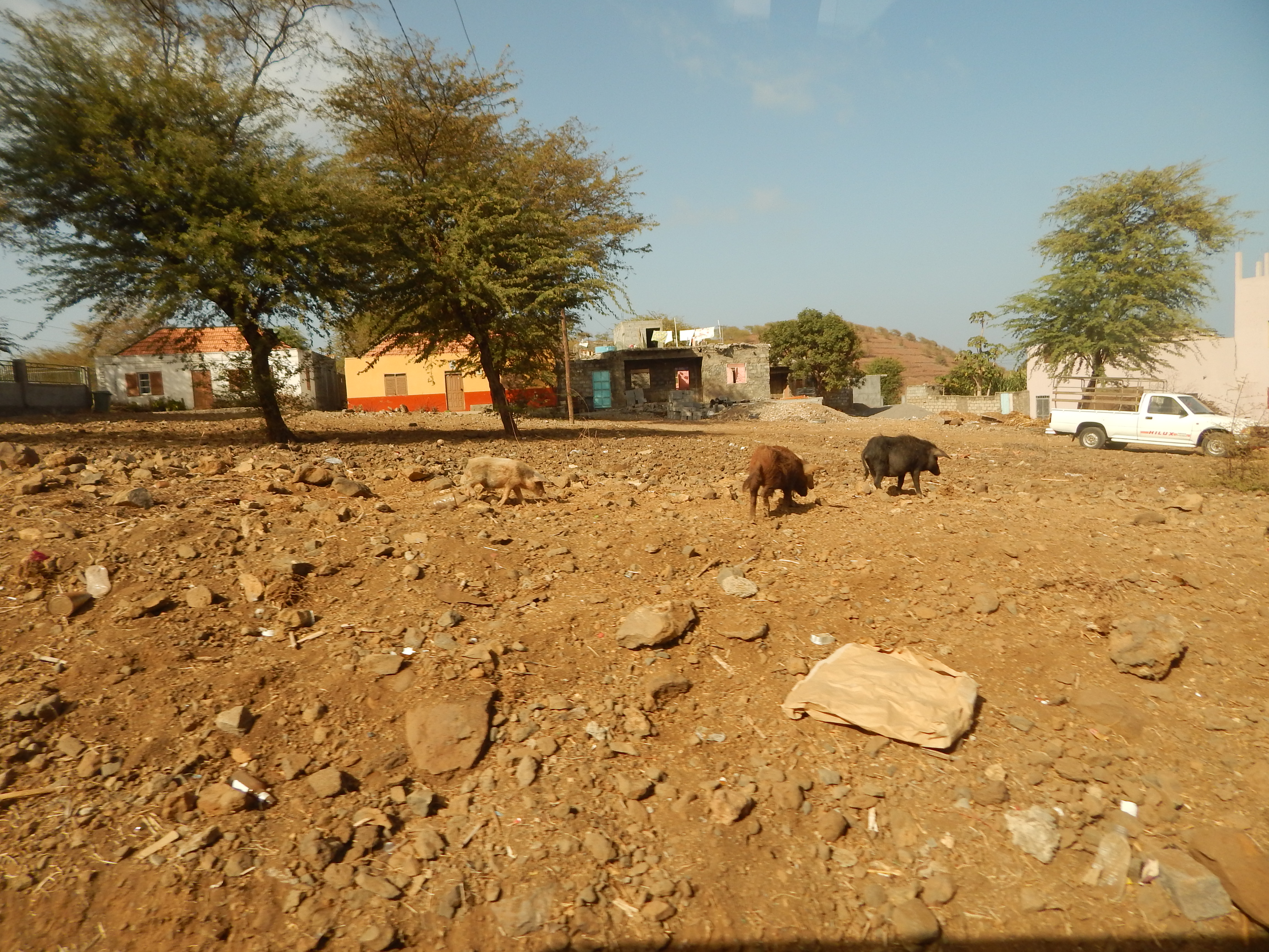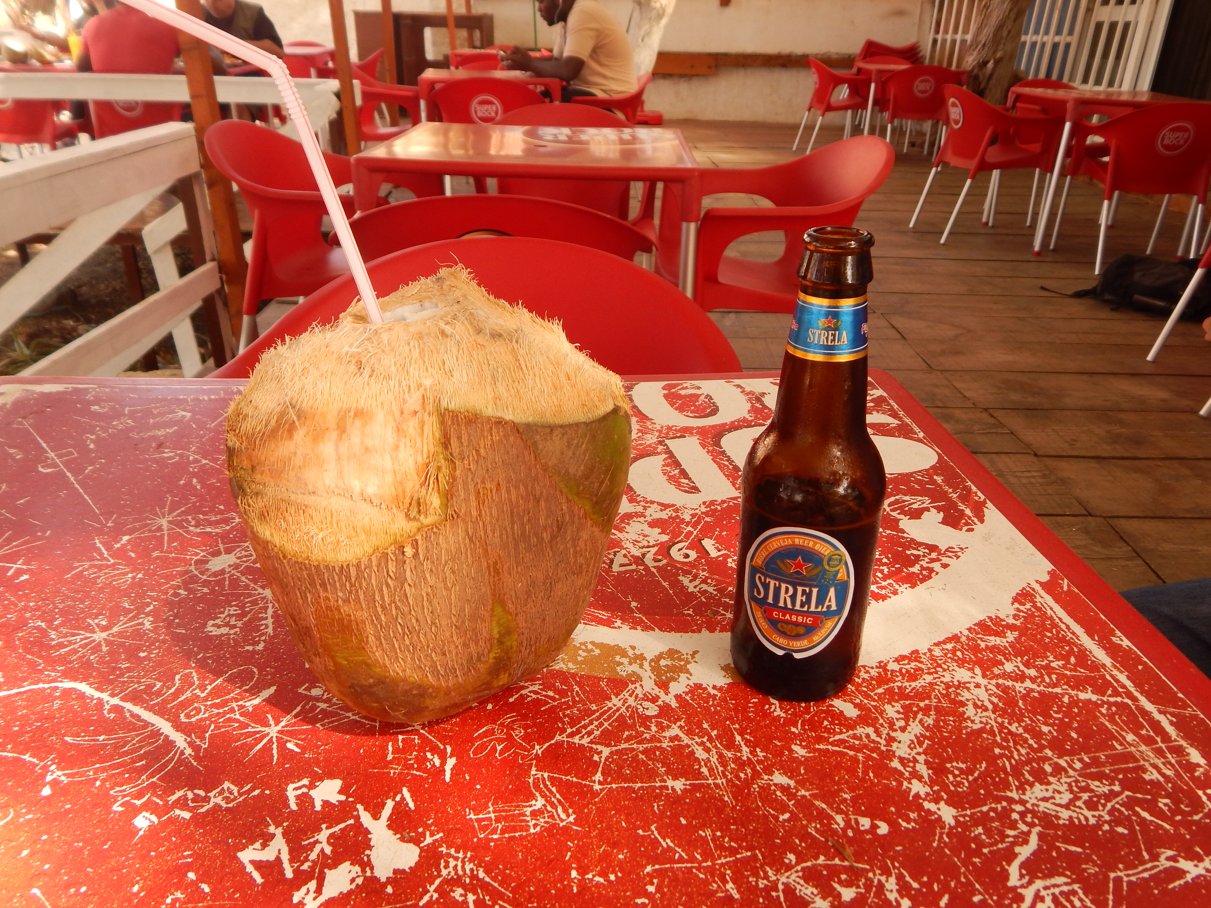 Wir machen Stop an einem schönen Strand in Tarafal mit Bar. Zum ersten mal habe ich Kokosnuß getrunken, lecker und erfrischend. Mein Mann ist Braumeister, er kostete natürlich das einheimische Bier.