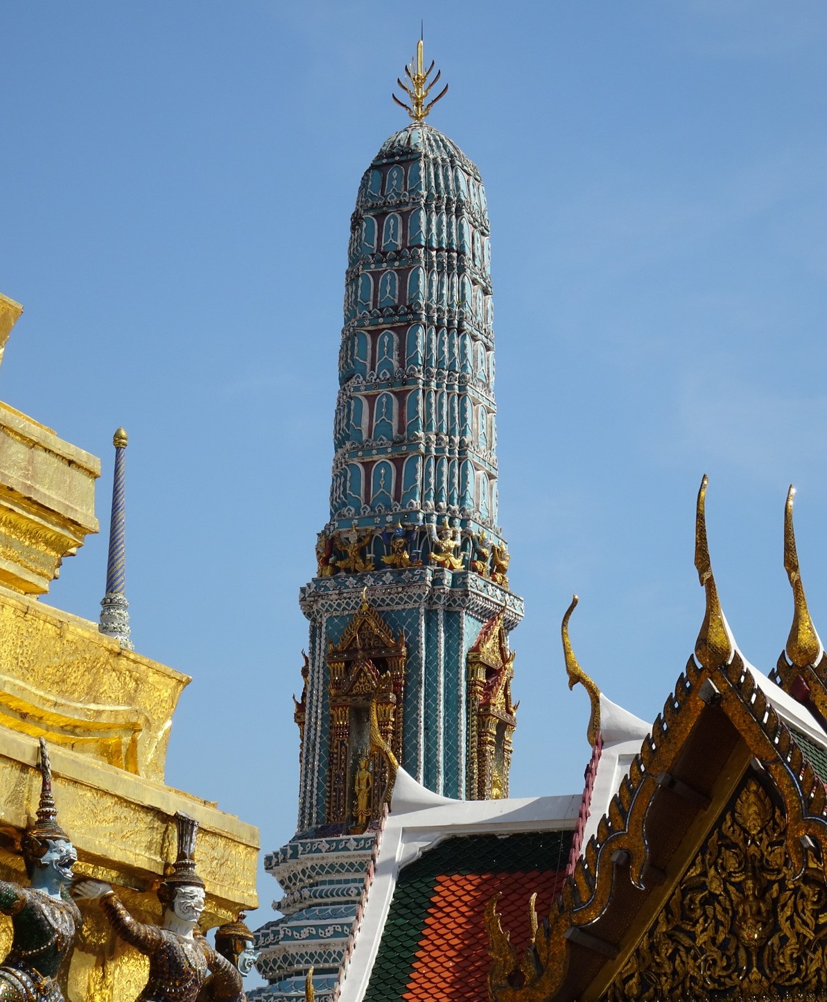 Der Smaragdbuddha war auch nicht schon immer hier, sondern auch er ist in der Vorzeit bereits weit rumgekommen. Der ging durch mehrere Hände, denn wie vielen Buddhas, werden auch ihm magische Kräfte nachgesagt. Der hier verheißt Wohlstand und Schutz vor Epidemien. Kein Wunder, dass er begehrt und eine beliebte Beute war. Wie der „Goldene Buddha“ von Wat Traimit hatte auch der zwischenzeitlich mal eine Gips-Tarnung und nur durch Zufall wurde entdeckt, was diese Tarnung bis dato verborgen hatte. Und nach der Demaskierung ging sie wieder los die Karriere, mit wechselnden Aufenthaltsorten in verschiedenen Ländern, über den Tempel „Wat Arun“ bis hinein in den Königspalast, bis hin zum Nationalheiligtum.
