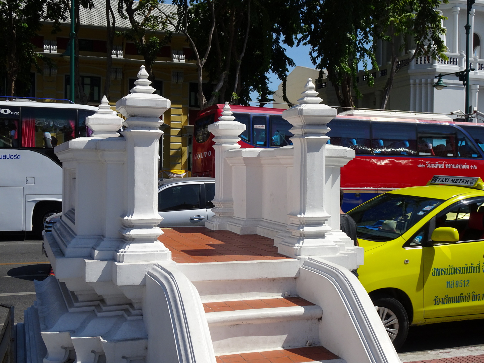 Den Umständen entsprechend zügig, geht es jetzt zum Grand Palace, dem Königspalst. Einfache Erklärung für dieses vergleichsweise flotte Fortkommen: Kein Bus verstopft mehr die Straßen, denn wohl sämtliche Ausflugsbusse der Umgebung stehen zu dieser vorgerückten Stunde schon hier auf dem Parkplatz. Die Insassen sind schon mal reingegangen, in den Grand Palace.