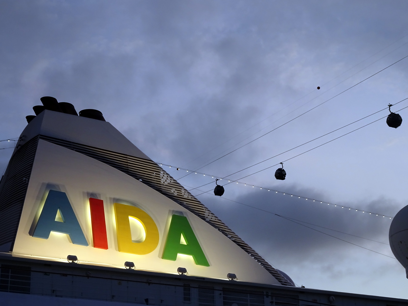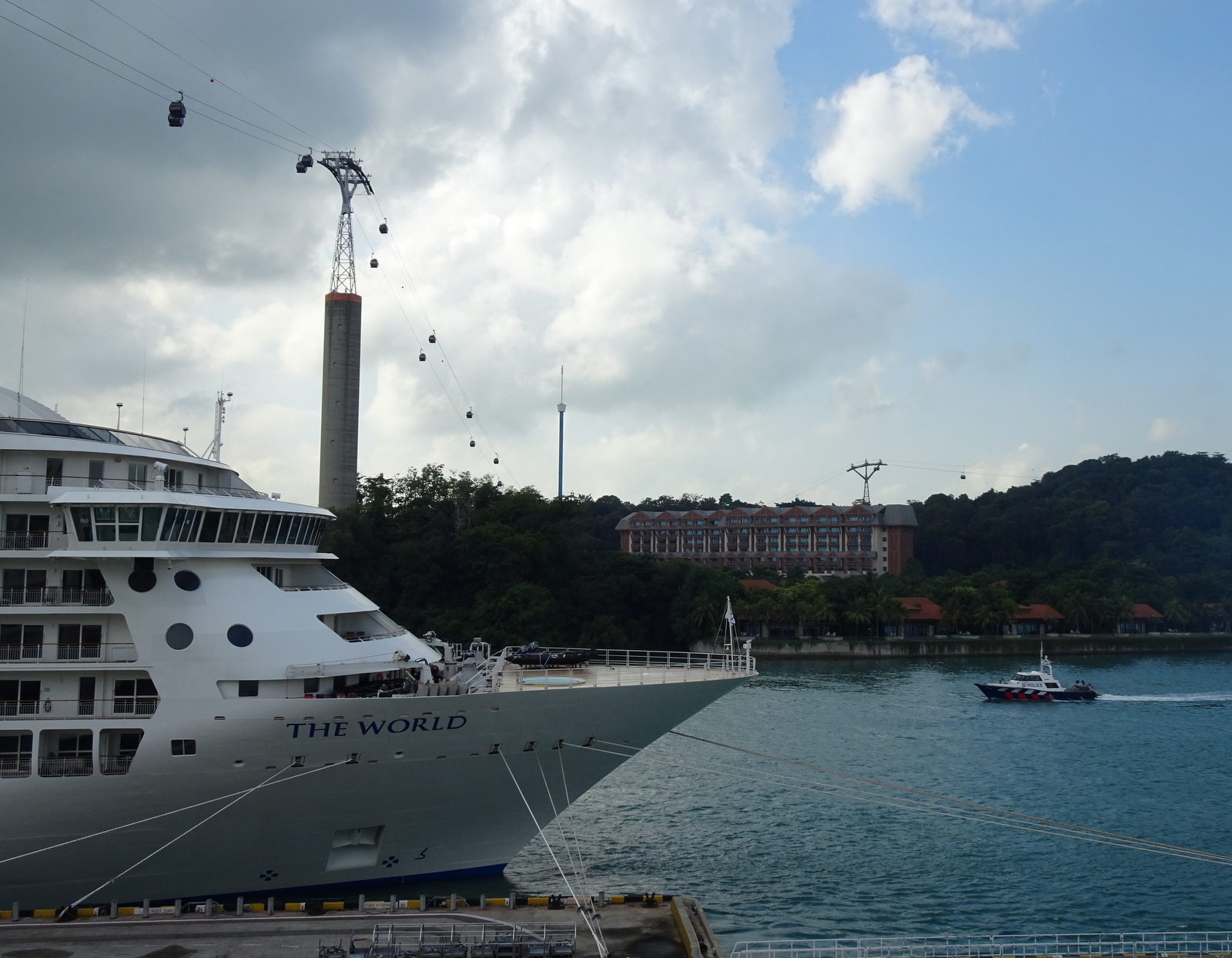 Hinter Sentosa-Island ist unser Liegeplatz Singapore Cruise Centre und über uns schweben die Gondeln