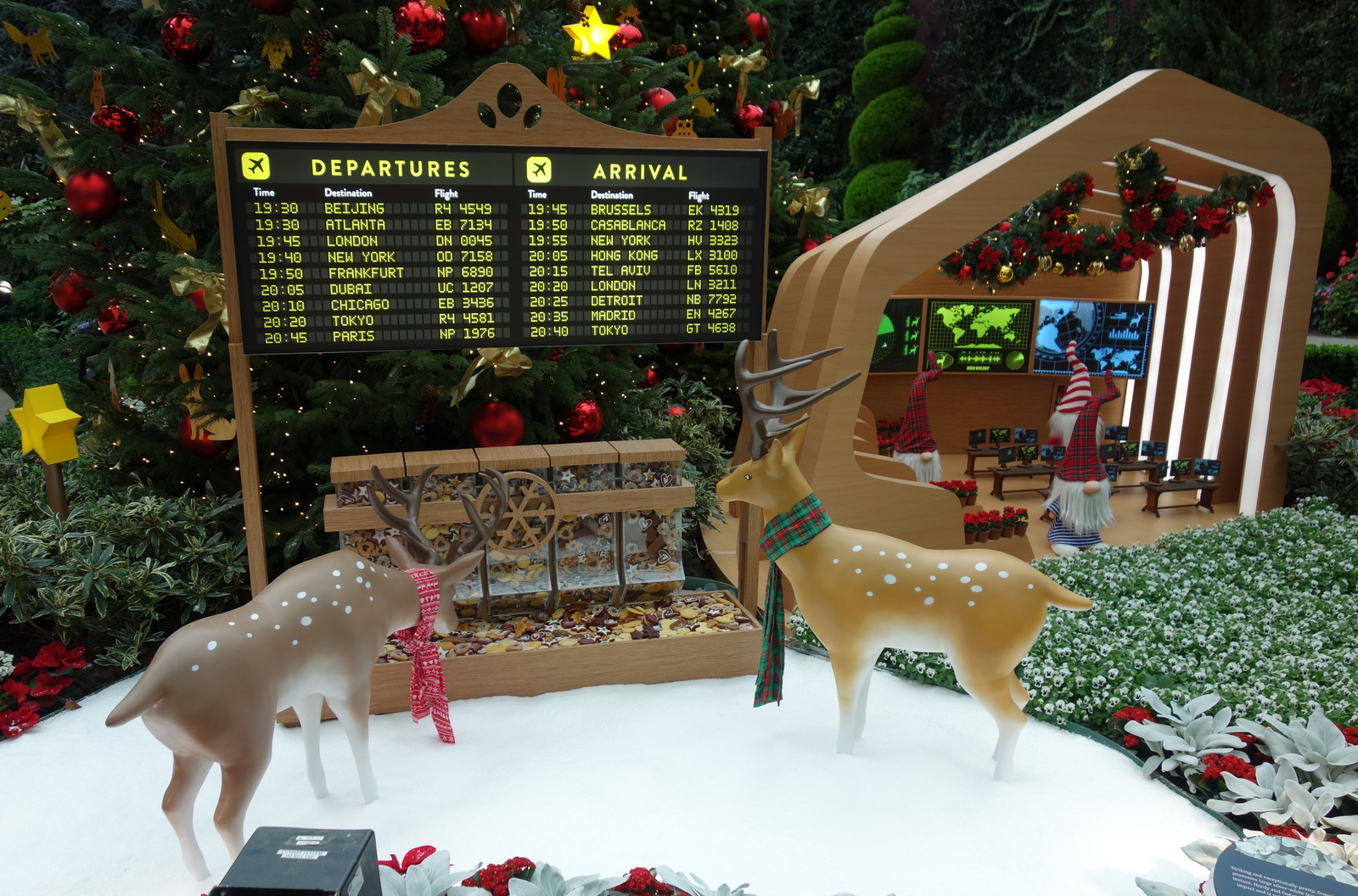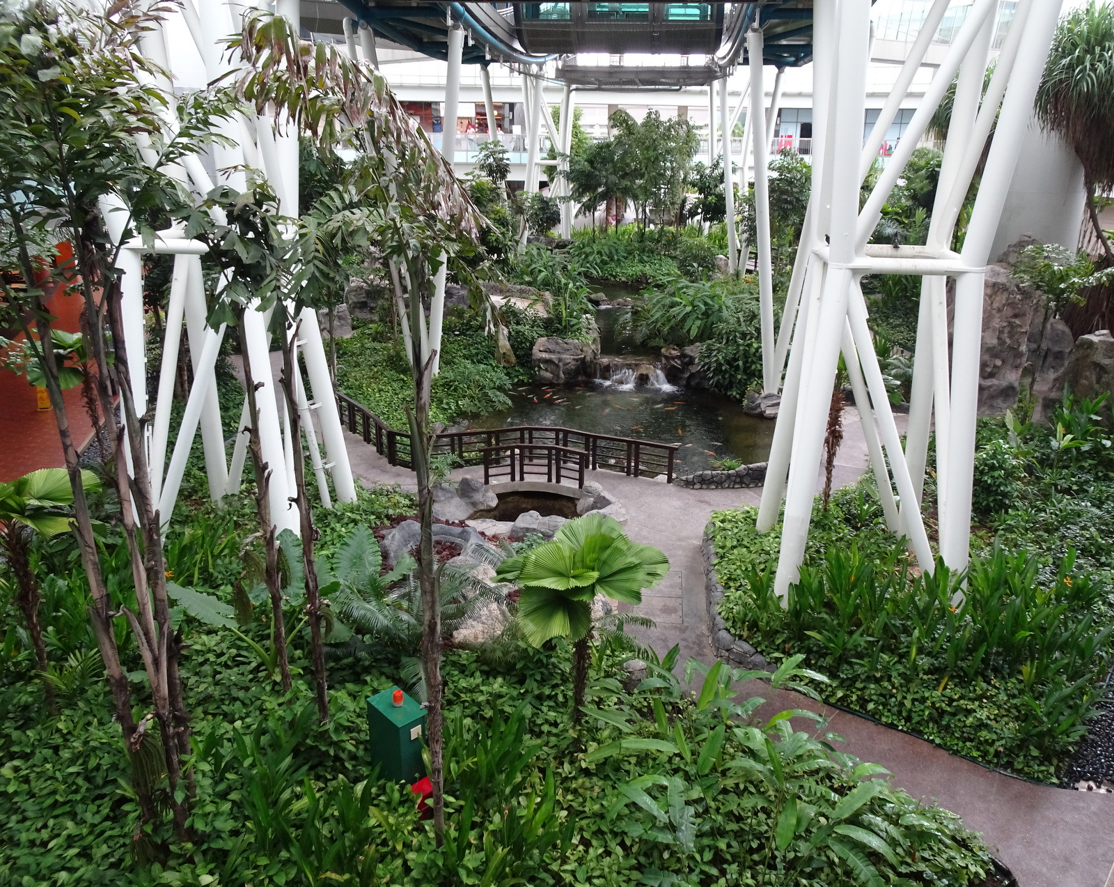 Draußen tobt der Monsun und hier drinnen ist zwischen Palmen und Farnen ein Weihnachtspfad mit Nikolaus, Weihnachtsmann, Engel, Wichteln etc. aufgebaut und ist für eine Dauerberieselung mit Weihnachtsliedern gesorgt.