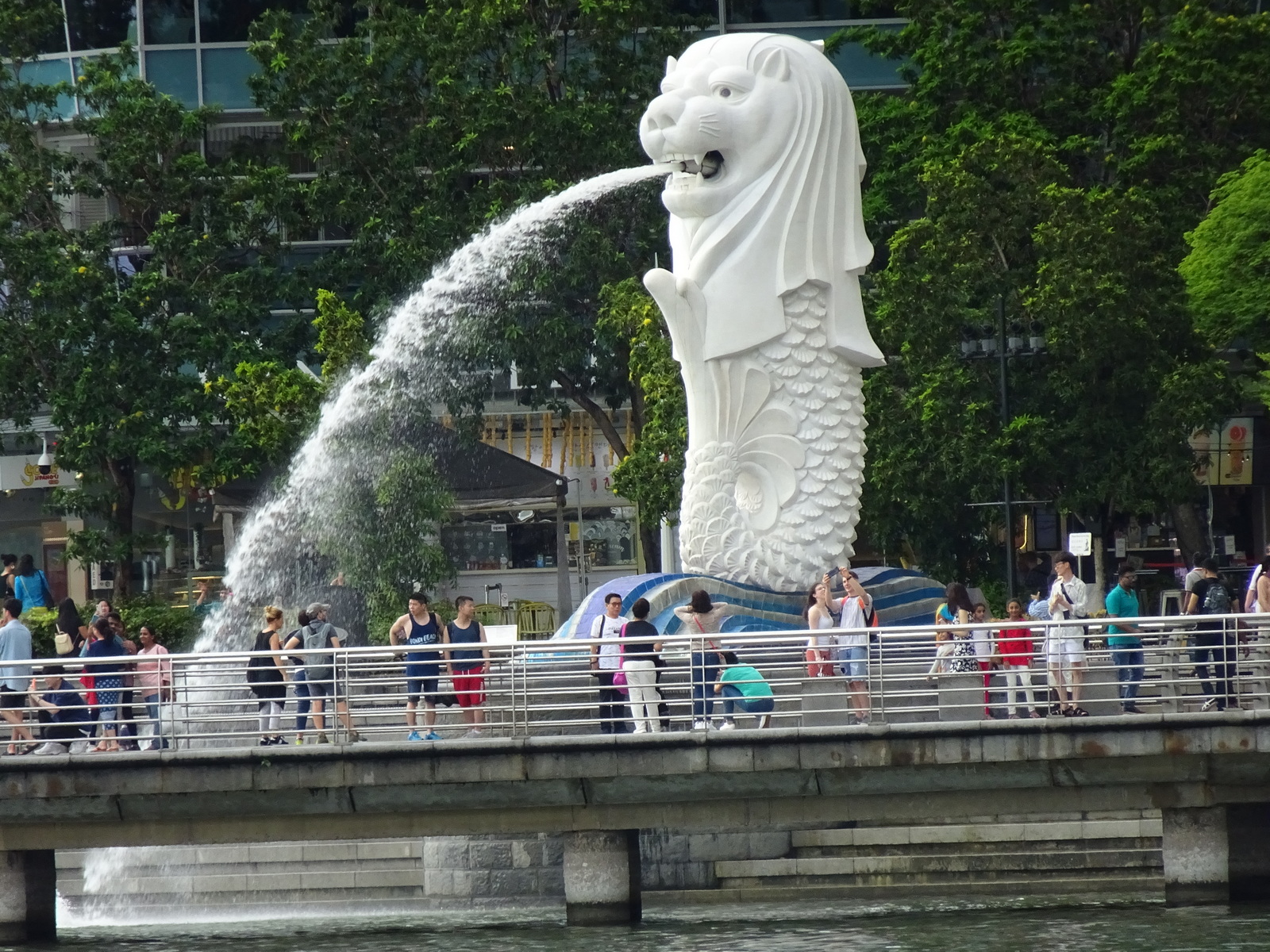 Eine Skulptur, halb Fisch, halb Löwe. Singapur, die Löwenstadt wie es übersetzt heißt, hat dort sein Wahrzeichen. Ein malayischer Prinz soll an diesem Fleckchen Erde hier, bei seinem Landgang, mal einem Löwen begegnet sein, der aber wohl eigentlich ein Tiger war. Wie Singapur nun in der Fremdsprache heißen würde, wenn es die „Tigerstadt“ wäre, dass weiß der Teddy nicht. Aber bei seinem Landgang begegnet der nun definitiv einem halben Löwen, -obenrum. Den halben Fisch hat man unten noch drangebastelt, um die Verbundenheit zum Meer darzustellen. Macht als Insel ja auch Sinn… Alles in allem ist das Wahrzeichen etwa 8 m groß und das hat gereicht, dass vor Jahren mal ein Blitz den Weg zu ihm gefunden hat, obwohl er doch eigentlich ein Glückssymbol ist. Ein größeres Glück ist es da, denkt sich der Teddy, nur 30cm klein zu sein. Das steigert die Überlebenschancen deutlich und er versengt sich weder das Plüschfell, noch braucht er sonstwie repariert zu werden.