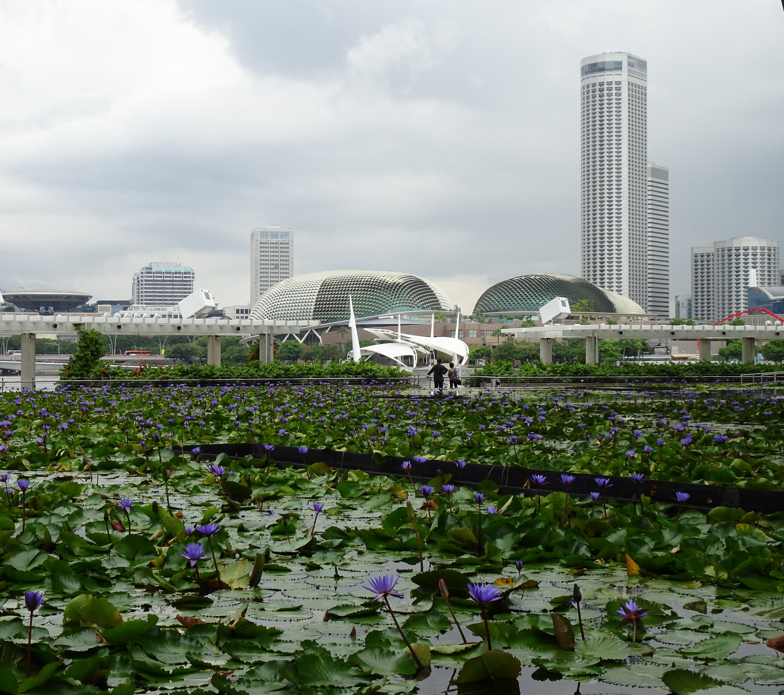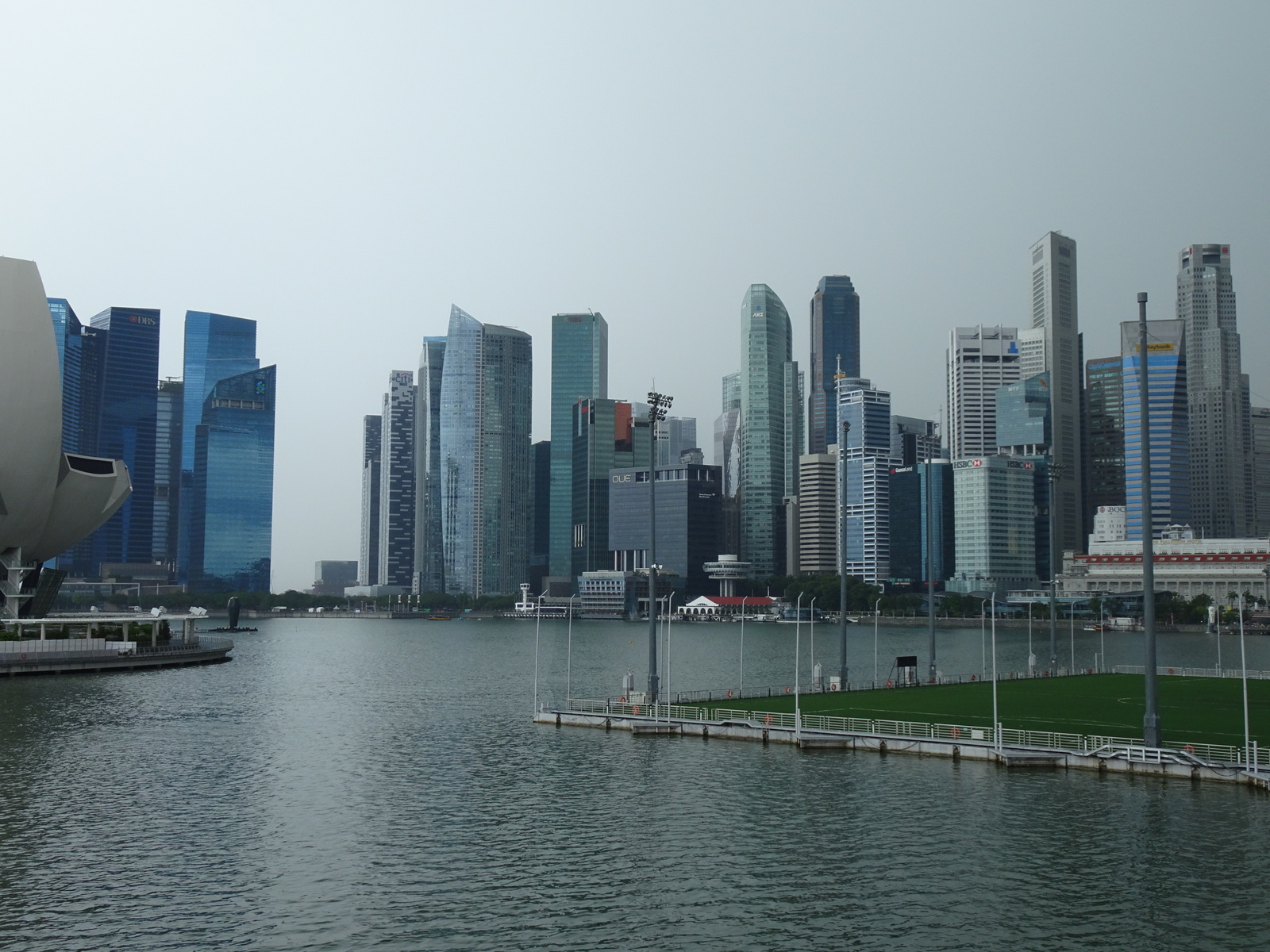 Ob es nun der akute Platzmangel von Singapur ist, jedenfalls ragt in die Wasserfläche des Marina Bay Reservoir ein riesiger Ponton herein, „Floating Stadium“,ein schwimmender Sportplatz und davor eine Zuschauertribüne, -Problem gelöst.