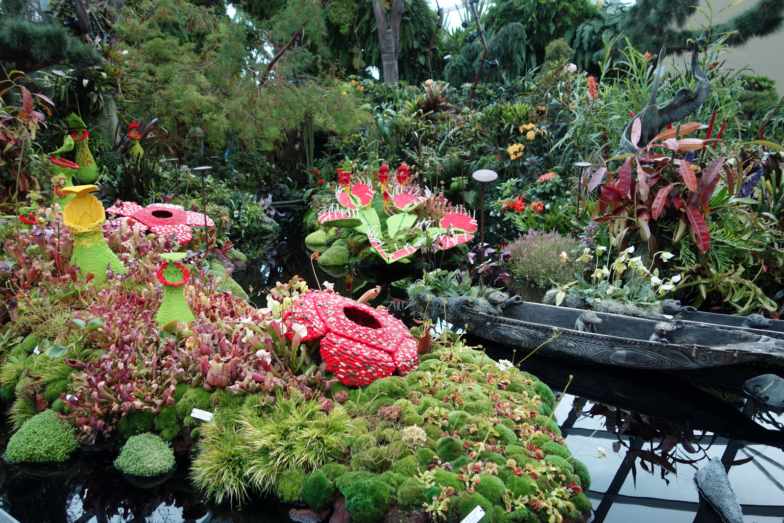 Der Schleier der Plane lüftet sich, wir sind drin in einer riesigen Glaskuppel, dem Flowerdome. Und hier laufen die Teddys jetzt erstmal keine Gefahr mehr durchzuweichen. Also freie Sicht auf die Pflanzen aus verschiedenen Teilen der Erde.