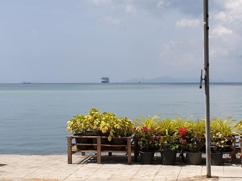 Nach fast 2 Jahren kommen wir wieder nach Koh Samui und schon bin ich mitten drin in meinen Erinnerungen. Die Bella lag damals auf Reede in der Nathon Bay. Dunkle Wolken hingen tief über der Insel und es wehte so viel Wind, dass die Wellen kleine Krönchen hatten. Der Tenderverkehr zwischen dem Schiff und der Insel wurde gegen Mittag kurzzeitig eingestellt – weil die bunten Holzboote während der Überfahrt etwas in Bewegung gekommen waren. Irgendwann hieß es: „Tenderverkehr zur Insel läuft wieder“. Mein Mann hatte keine Lust, mit an Land zu gehen und so überließ er mich meiner Abenteuerlust und wünschte mir viel Spaß. Ja, den hatte ich dann auch. Kaum entfernte sich das bunte Boot von der Bella, öffneten sich die Wolken und es goss aus vollen Kübeln. Mit mir im Tender waren noch ein paar Mitglieder der Crew, die in ihrer knappen Freizeit schnell mal an Land wollten, um ein paar Einkäufe zu machen. Wir lachten und johlten wild durcheinander, der Scheibenwischer des Bootes schaffte es schier nicht, klare Sicht zu bekommen. Das Boot schwankte hin und her und nachdem die Pier in Sicht kam, zack, war der Regenschauer vorbei. Mensch, das war nun echt ein Erlebnis … Damals dachte ich an meinen Mann, der bestimmt besorgt in Richtung Land schaute. Dies jetzt nur mal vorweg zum heutigen Besuch auf Koh Samui.