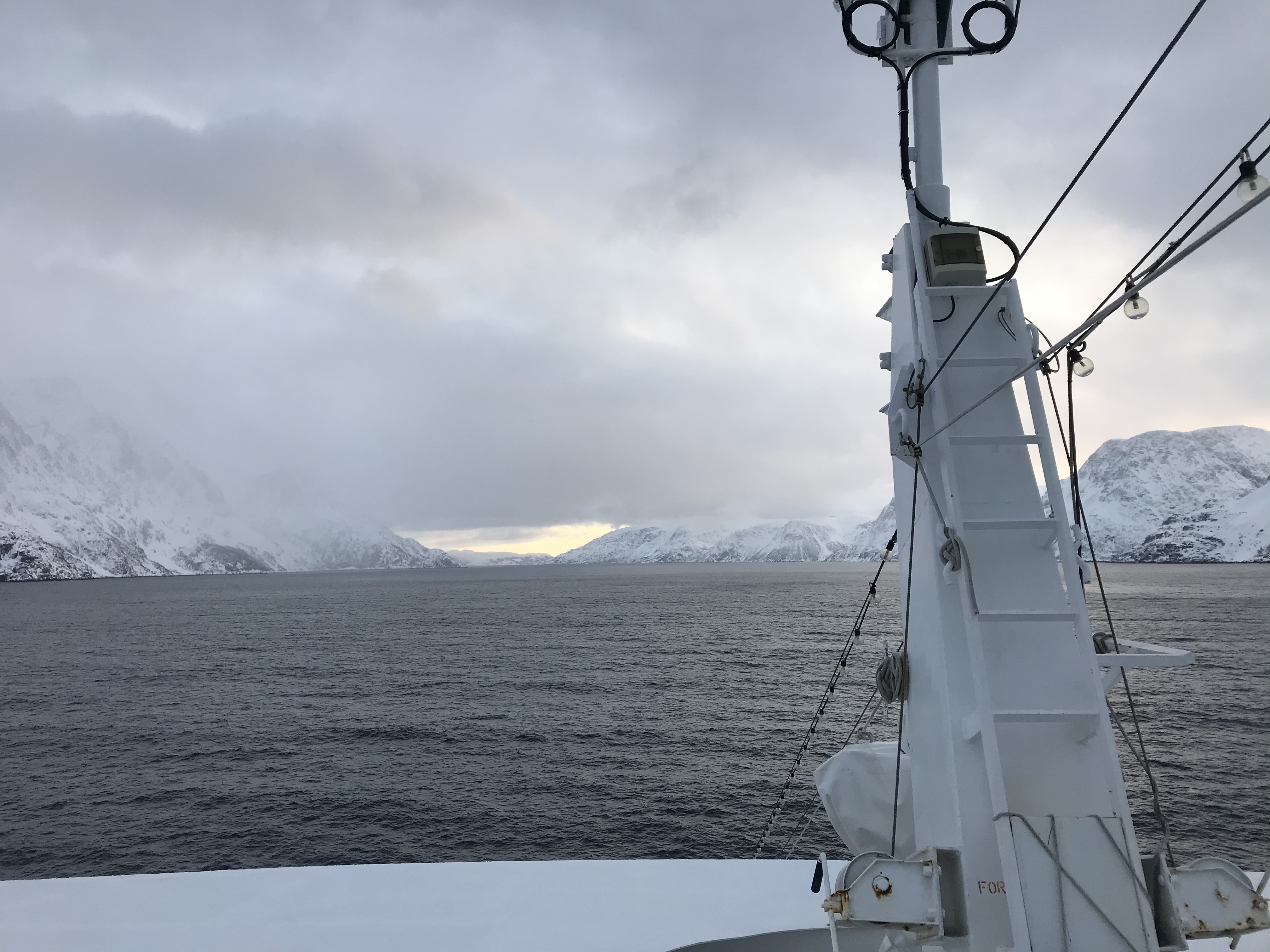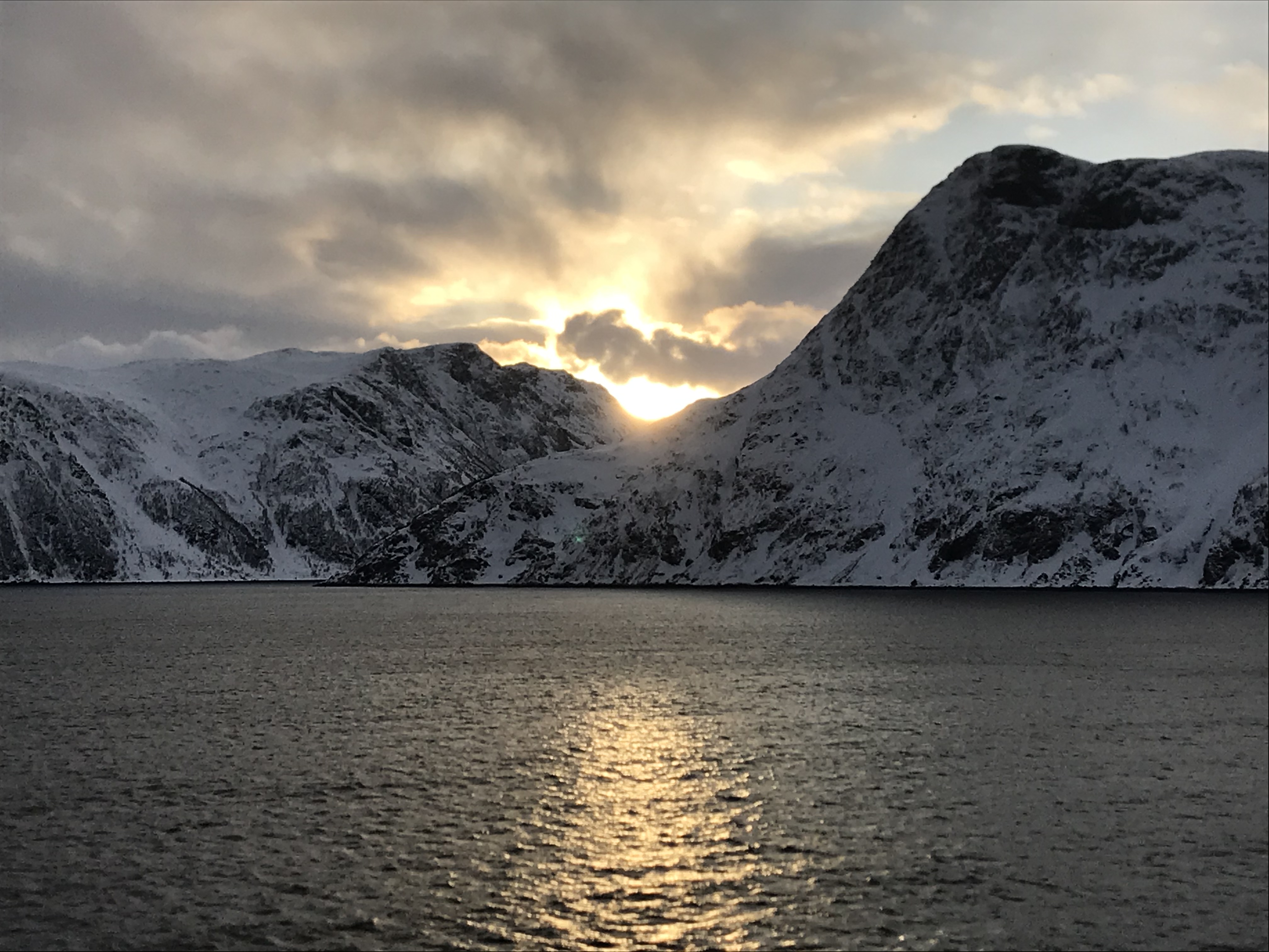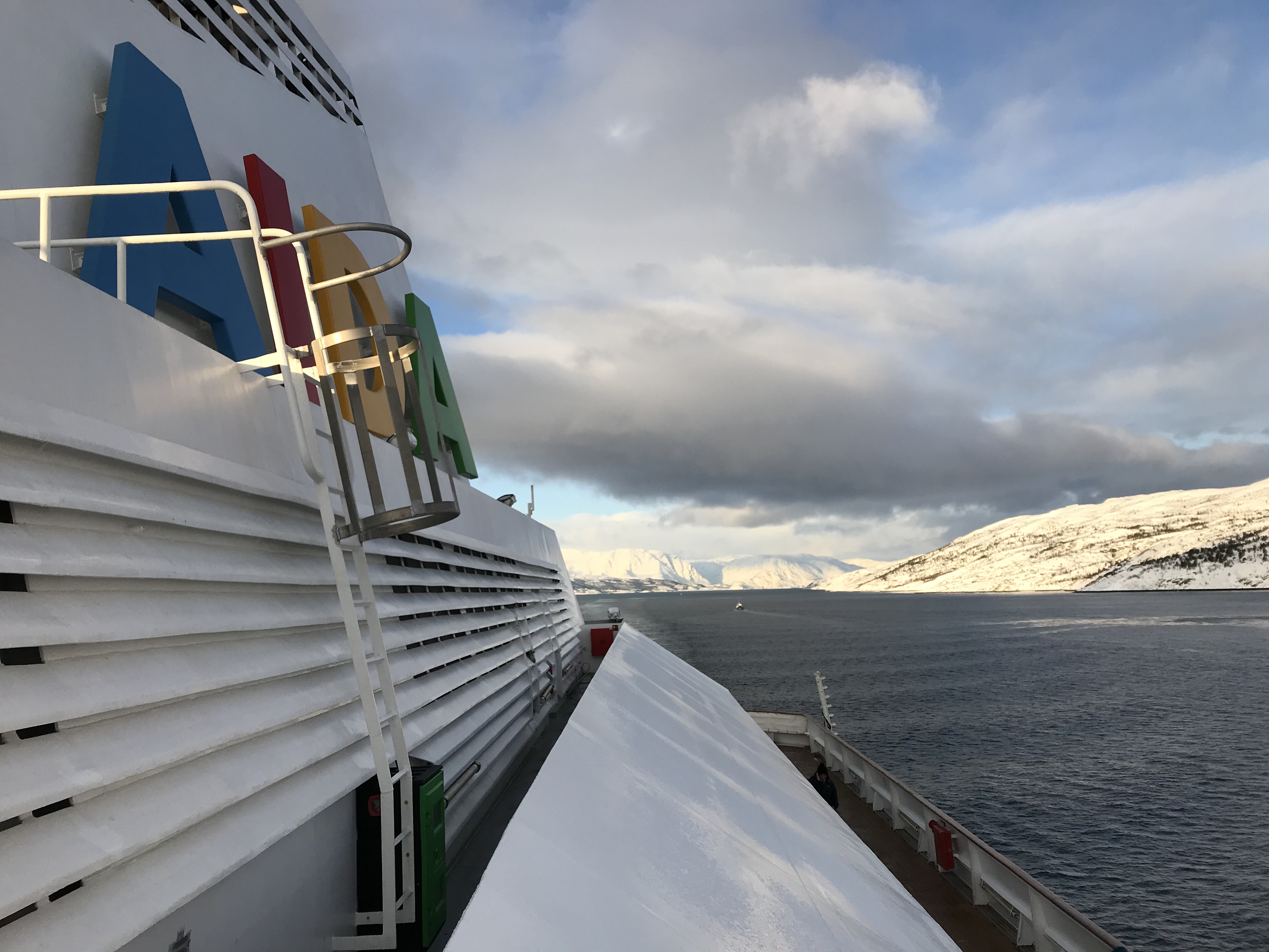 Wir legen gerade in Alta an. Heute Morgen ging es durch einen Fjord nach Alta, es war zuerst sehr stark bewölkt jedoch kam zum Glück immer mehr die Sonne durch und jetzt wurde es schönes Wetter. Aber auch bei Nebel ist es ein schönes Schauspiel wenn nach und nach die Sonne durchkommt. Der Lektor erzählte etwas über die Lautsprecher über Fjorde und Norwegen bei der Einfahrt und an Deck gab es warme Getränke und was zu Essen. Der Wind ist eisig kalt, heute Nacht soll es über -5 grad geben. Dann wird die Cara zum Eiszapfen.