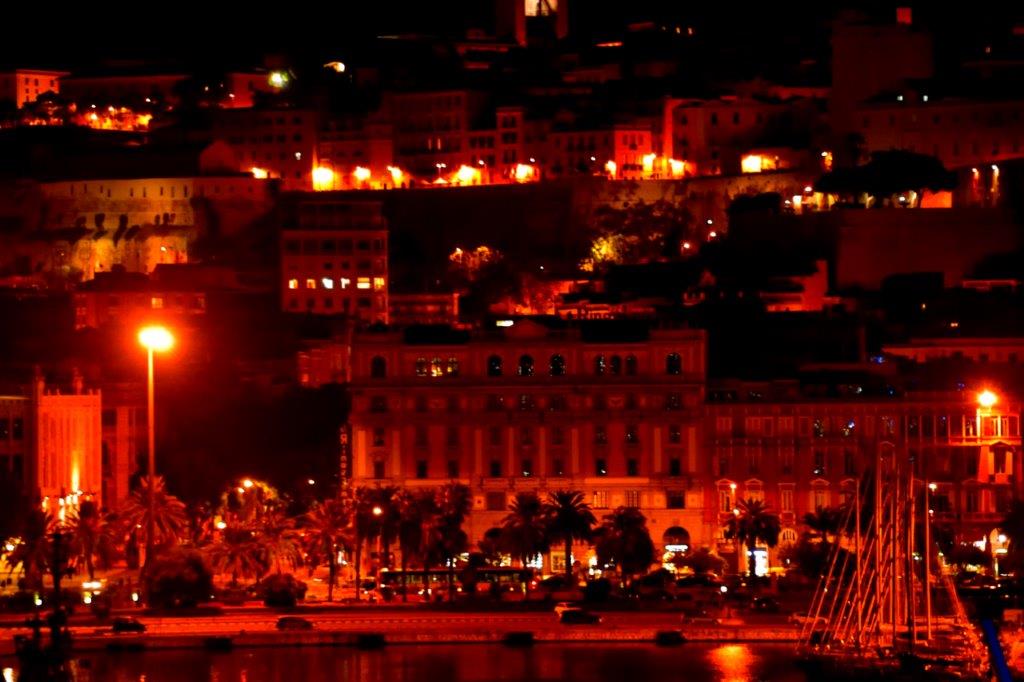 Kurz vor 7 Uhr waren wir vor Ort. Die Lichterkette von Cagliari mit der auf dem Hang liegenden Altstadt und verschiedene Fähren begrüßten uns.