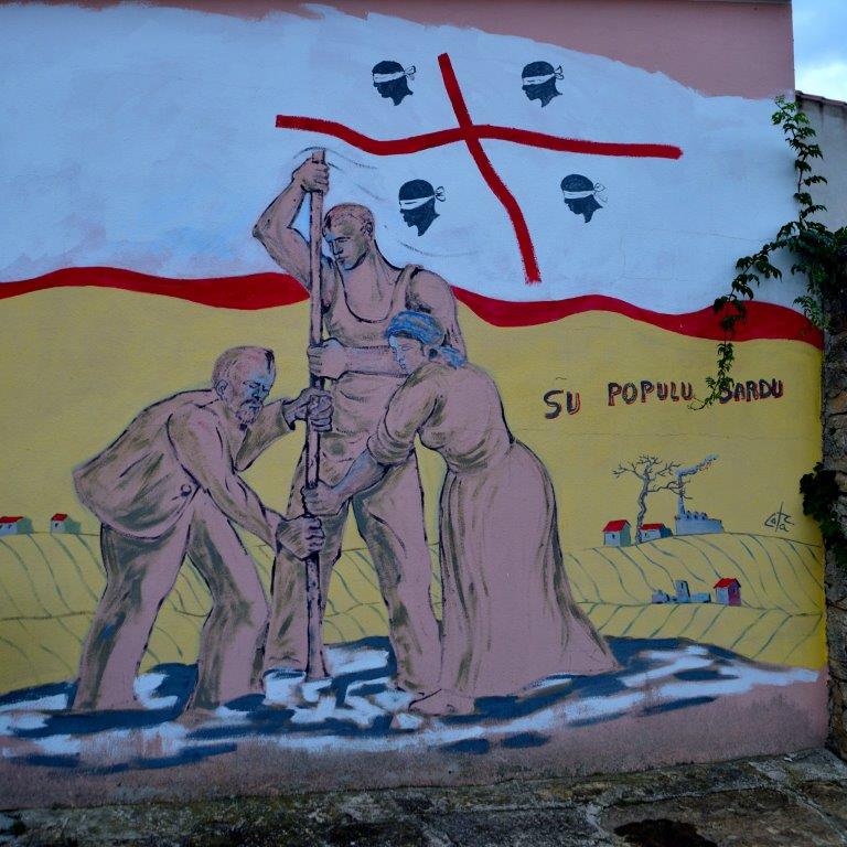 Wir erreichten unser erstes Tagesziel. Mitten im Ort Villamar. Die Bar dell´ Arte, in der wir Cappuccino & Co. schlürften. Aber dieses war nicht der Grund unseres Halts. In diesem Ort lebte der Maler Antioco Cotza, der Häuserfassaden und Mauern mit Allerlei aus dem Leben und der Geschichte Sardiniens verschönerte (Murales). Weltliche Themen. Historische Themen. Hinweise auf die Musikszene. Religiöse Wandmalerei durfte auch nicht fehlen. Wie auch nicht das leicht abgewandelte Wappen der Insel.