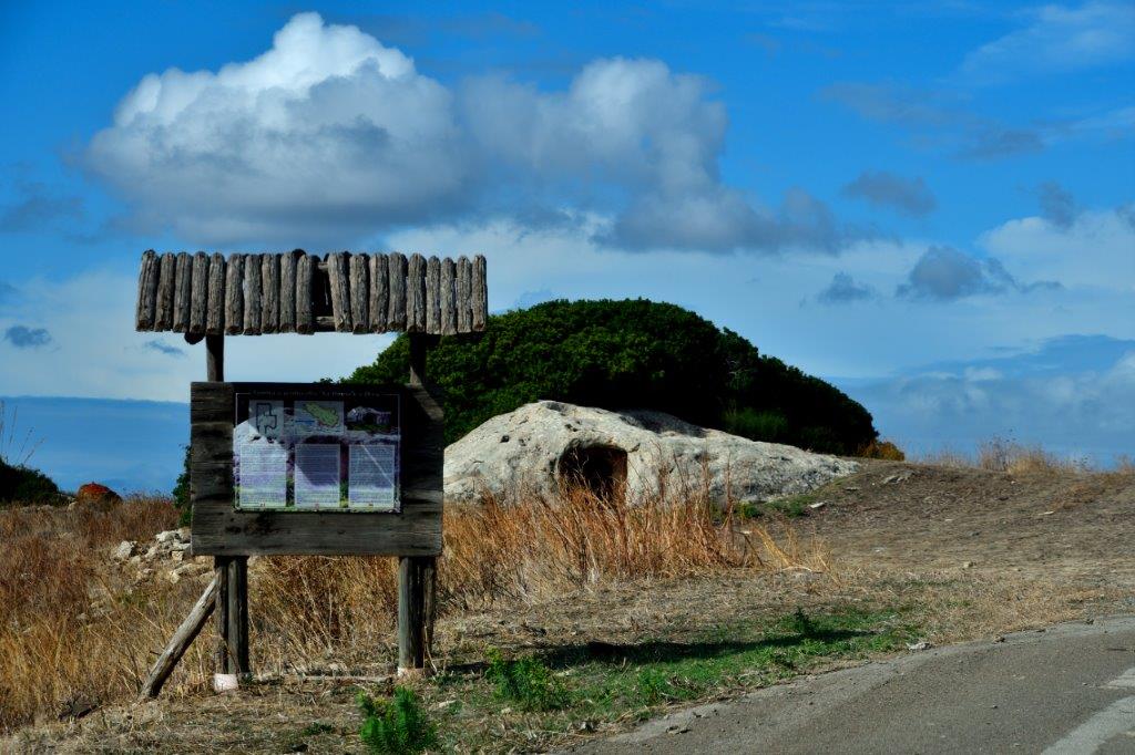 Der Grund, dass Dirk den Bus stoppte und uns herausscheuchte. Wir standen vor einem Domus de Janas, übersetzt Haus der Feen. Wir fanden sie nicht im Inneren des Felsbuckels – die Feen. Dafür aber kleine leere Kammern. Wofür wurden sie herausgeschlagen? Vor dem Nuraghenzeitalter nutzten die Bewohner der Insel diese „Behausungen“ als Grabstätten, von denen es auf Sardinien mehr als 1.000 geben soll. Die Verstorbenen wurden oben auf dem Felsbuckel den Tieren aus- oder vorgesetzt. Die übrig gebliebenen blanken Knochen wurden mit Blut rituell gewaschen und – soweit wie möglich zusammensetzt – in Foetushaltung in einer Kammer beigesetzt; anschließend wurde das Feenhaus mit einer Steinplatte verschlossen. Bis zur nächsten Beisetzung. Für heutige Zeiten grausam, aber in den Urzeiten nicht unüblich.