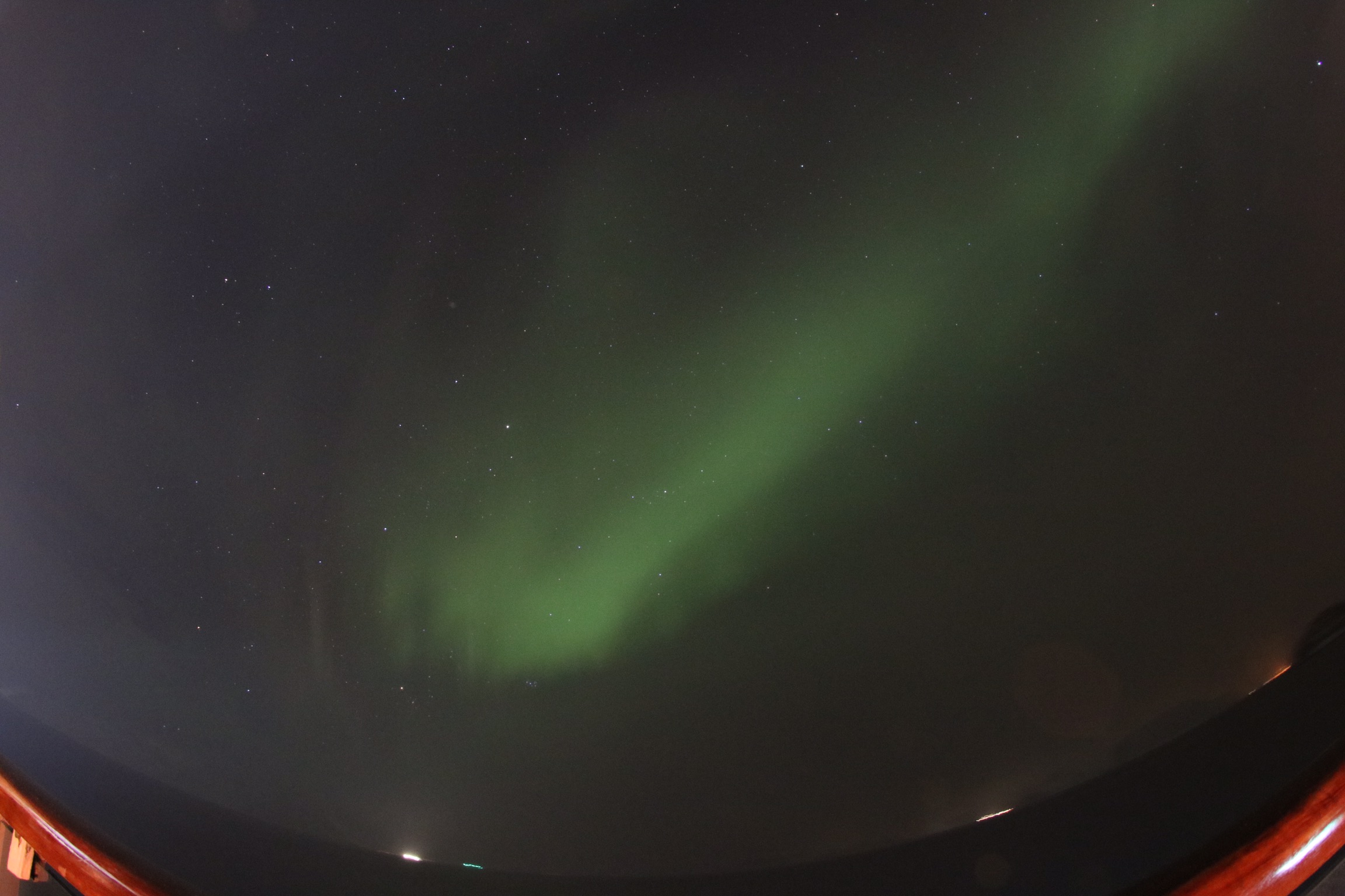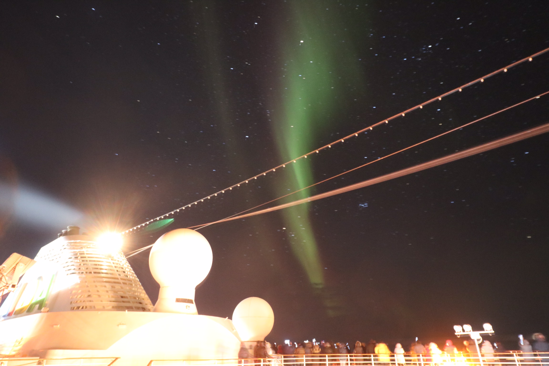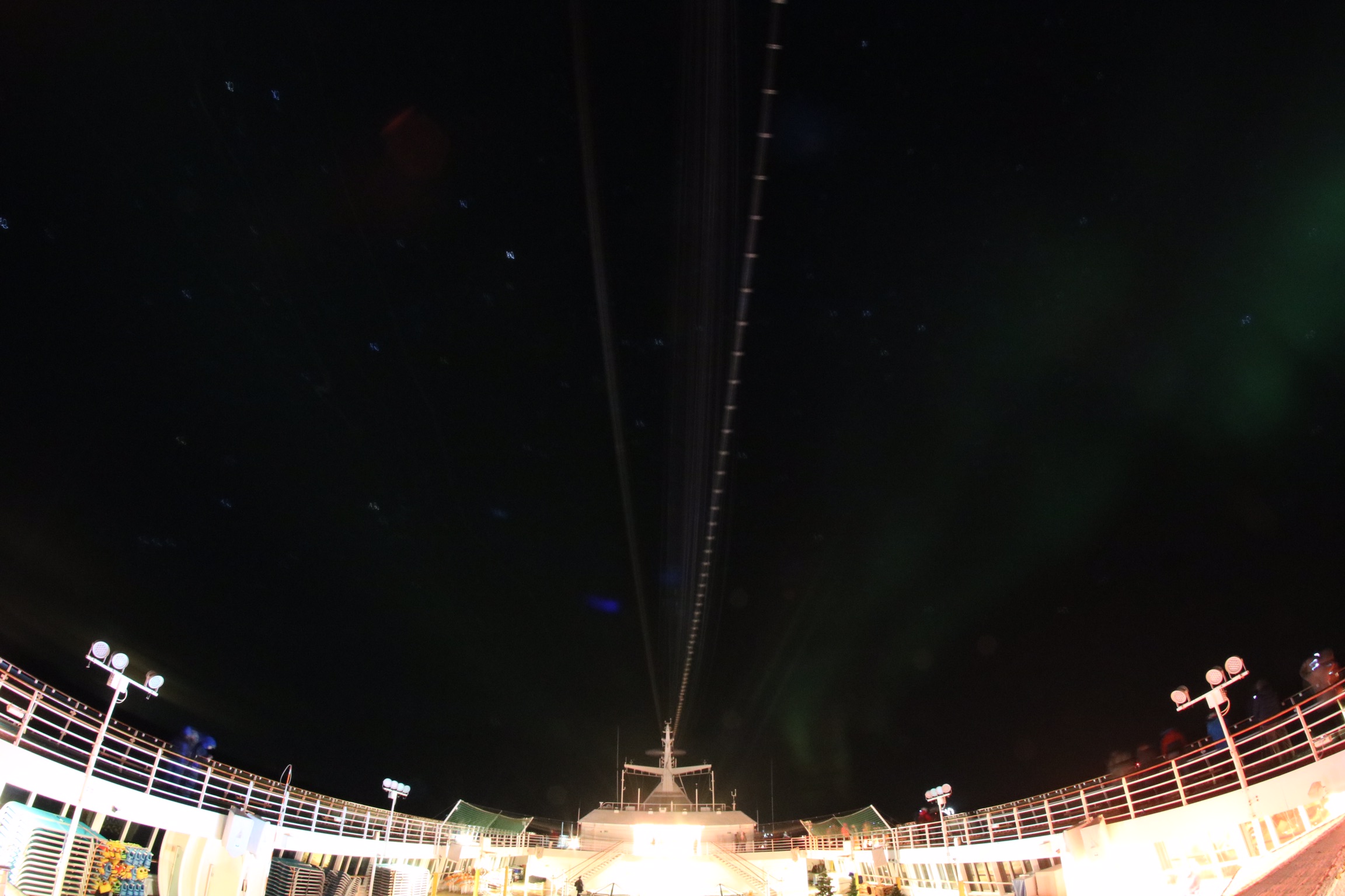 während des Abendessens im markttestaurant kam dann wieder die Durchsage Polarlichter zusehen. Essen tue ich meist in der zweiten Tischzeit im marktrestaurant da ist meistens recht leer ne daher ganz angenehm zu essen. Selbes spiel wie immer. Sachen holen, an Deck gehen und etwas mit dem Photo rumspielen.