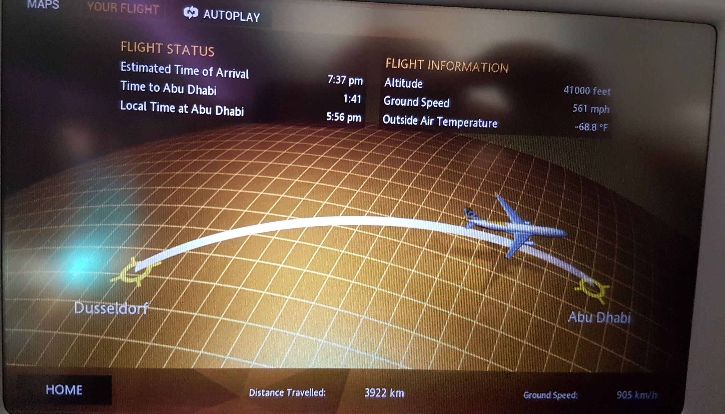 Pünktlich ging es dann mit Fug EY 024 um 10:05 Uhr von Düsseldorf nach Abu Dhabi.
