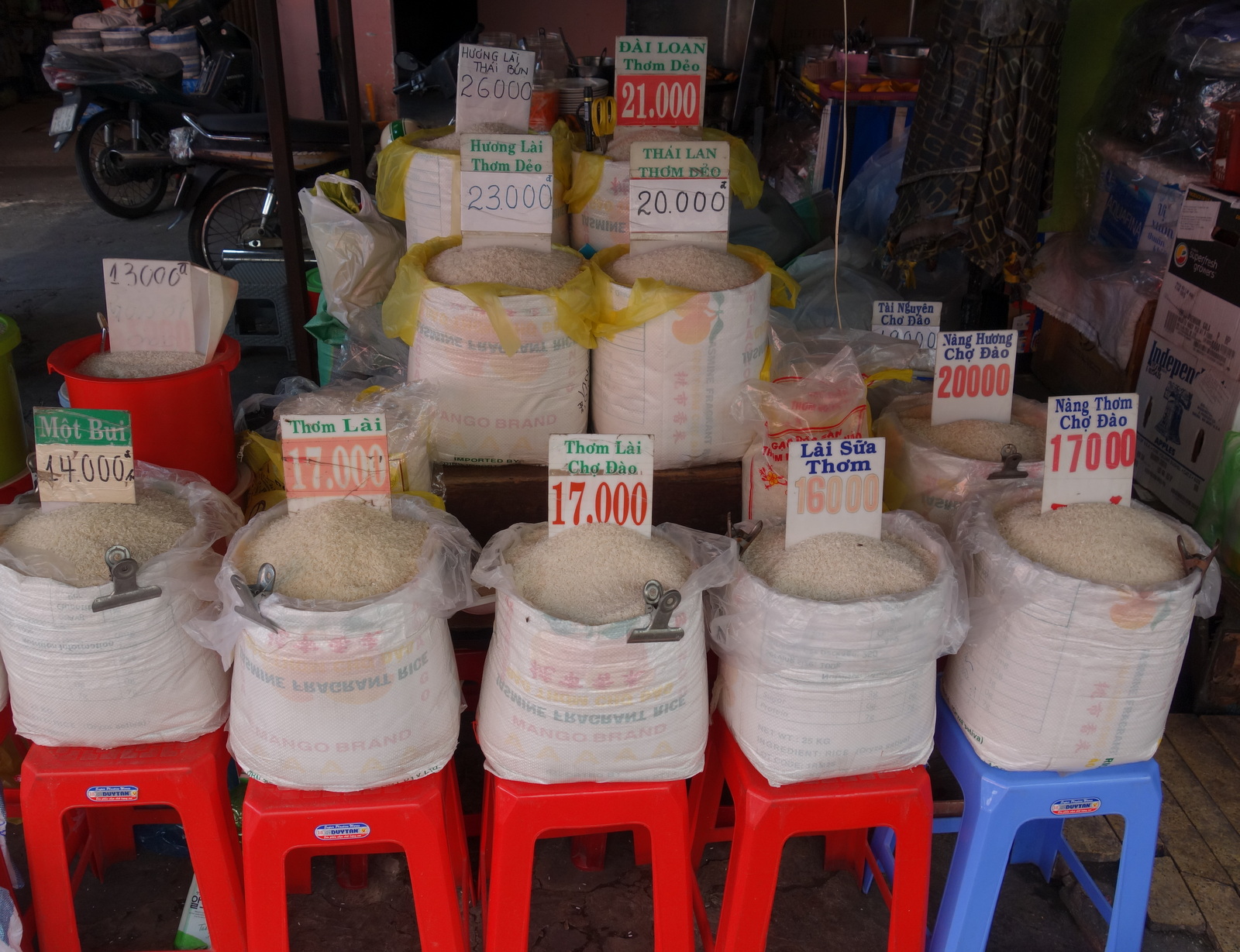 Es sind einige Felder mit Reis, der mal frisch gepflanzt, mal kurz vor der Ernte stehend auf seinen Einsatz z. B. in den Garküchen wartet, oder darauf, in Säcke gefüllt zu werden. Nur „Kochbeutel“, die sieht der Teddy hier nicht, -komisch.