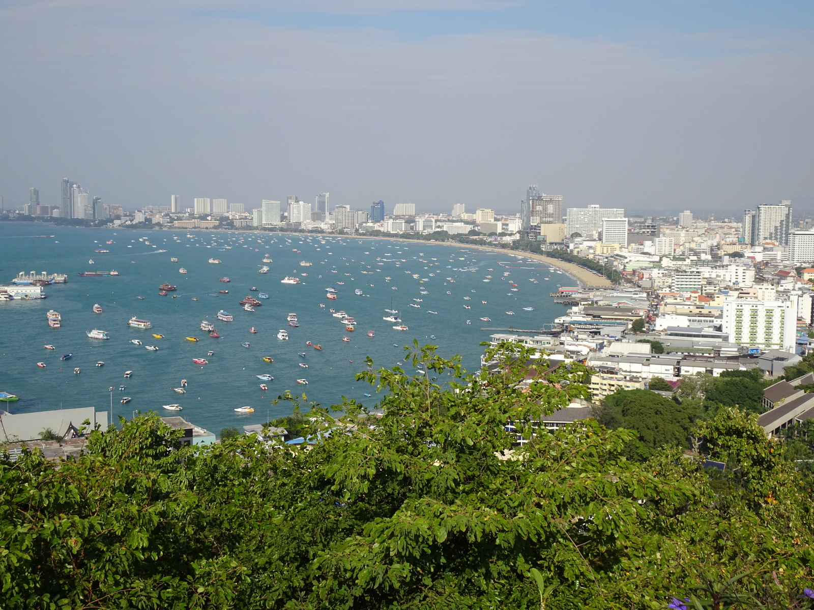 Eben noch da unten langgefahren, schauen wir nun auf die Bucht, die Bucht von Pattaya.