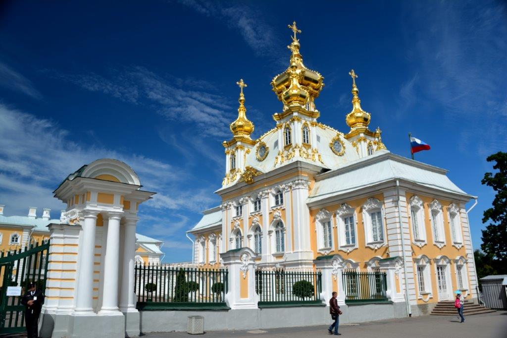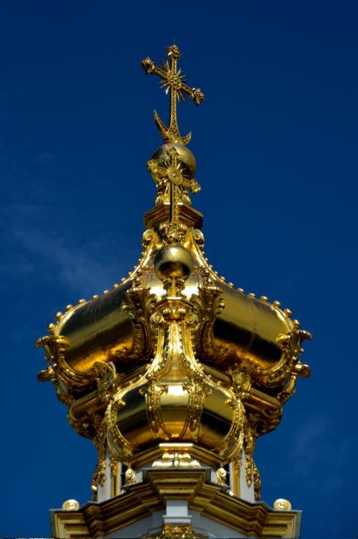 Oberhalb der Kaskaden erhob sich 16 m über dem Meeresspiegel (und damit eine der vielen Voraussetzungen für die Schaffung des Wasserdrucks) der Große Palast. Peter hatte sich bei seinen Reisen in den Westen von den Prachtbauten – insbes. von den französischen – inspirieren lassen. Barock in reinstem und auch klarstem Stil. Dabei auch verspielt. Und lang … ganze 275 m. Aber nicht bei der Einweihung im Jahre 1723. Damals hatte der Palast eher bescheidene Ausmaße. Zu klein für Zarin Elisabeth, die ab 1745 innerhalb von 10 Jahren den leidlich großen Palast auf heutige Maße erweitern ließ. Selbstverständliche verwirklichten sich die ihr folgenden Zarinnen und Zaren bei diesem absolut majestätischen Bauwerk. Das westliche Ende des winzigen Palastes krönt der Pavillon „Unter dem Wappen“. Die goldene Spitze ziert der russische Doppeladler. In den Räumlichkeiten des Pavillons wurden Festlichkeiten und Zeremonien wie Hochzeiten und Taufen „eingeläutet“.