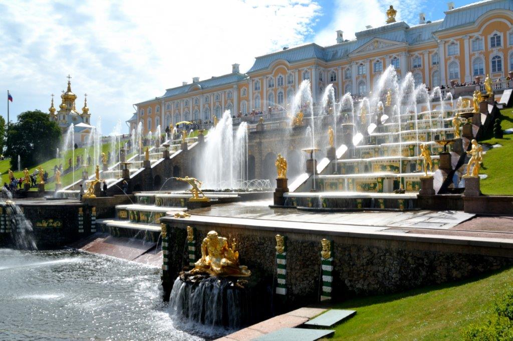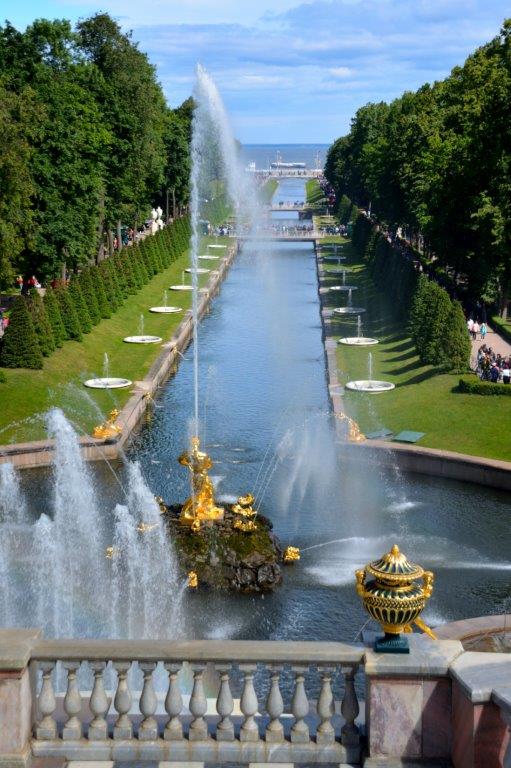 Wir entfernten uns immer mehr von der Kaskade – wurden aber erneut vom Gesamtensemble aufgehalten. Eine einzigartige Pracht – die von vergoldeten Statuen begleiteten Fontänen! Das die Kaskade hinunterfließende Wasser fand sich in einem großen Becken wieder, in dessen Mitte die Samson-Fontäne Wasser 22 m hoch schleuderte. Das Wasser schoss aus dem Maul eines Schweden symbolisierenden Löwens. Der Rachen wurde von Samson aufgerissen. Samson, der Mütterchen Russland symbolisierte. Die gesamte Statue sollte an den für Russland eminent wichtigen Sieg in der Schlacht bei Poltawa (1709) erinnern. Der Sieg, der im Zweiten Nordischen Krieg nach nicht wenigen Niederlagen das Glück zugunsten der neuen Großmacht in Osteuropa wendete.