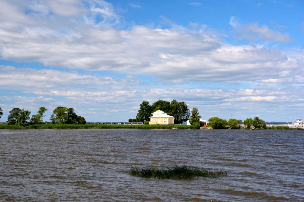 der das Wasser von den Kaskaden und dem Becken aufnahm und im Finnischen Meerbusen entließ. Dort in etwa standen wir und schauten über das bewegte Wasser auf den Schiffsanleger. In der Ferne erkannten wir Kronstadt. Die goldene Kuppel der Marine-Kathedrale des Heiligen Nikolaus überragte alles;