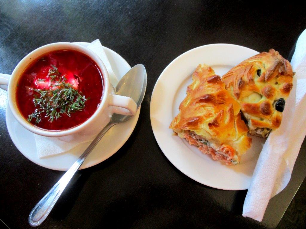 Ein riesiger vierspuriger Kreisverkehr, der von drei riesigen, gerundeten Gebäudekomplexen begrenzt wurde. Alte russische Wertarbeit, kurz nach Stalins Tod, aber in dem von ihm bevorzugten Stil erbaut. Das Schönste in dem von uns angesteuerten Komplex war „Stolle“, ein Restaurant, in dem wir von einem verlockenden und appetitanregenden Geruch empfangen wurden. Sofort steuerten wir die Theke an – die Auslagen verführten und verstärkten unseren Hunger! Dass es als Vorsuppe Bortscht gab, verstand sich von selbst. Pelmini mit frischen Kräutern …